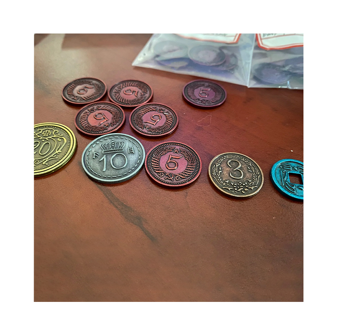 sada kovových mincí je určena pro fanoušky hry Scythe a sběratele. Sada obsahuje nádherně vymodelované kovové peníze. Balení Scythe – kovové mince obsahuje: 25 (20mm) $1 mincí, 15 (22mm) $3 mincí, 15 (24mm) $5 mincí, 15 (26mm) $10 mincí,10 (30mm) $20 mincí.