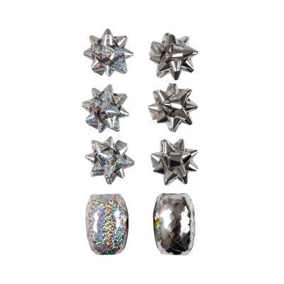 Chcete, aby vaše vánoční dárky vypadaly opravdu slavnostně? Tento stříbrný set ozdobného balení obsahuje vše, co potřebujete – vázací stuhy ve vajíčku a nalepovací rozety, které hezky drží tvar. Kombinace metalické a holografické stříbrné barvy pro dokonale sladěné Vánoce. Balení obsahuje: 3 metalické kokardy, 3 holografické kokardy, 1 metalickou stuhu a 1 holografickou stuhu. Šířka stuhy: 5 mm Délka stuhy: 2 × 20 m Průměr kokardy: 5 cm
