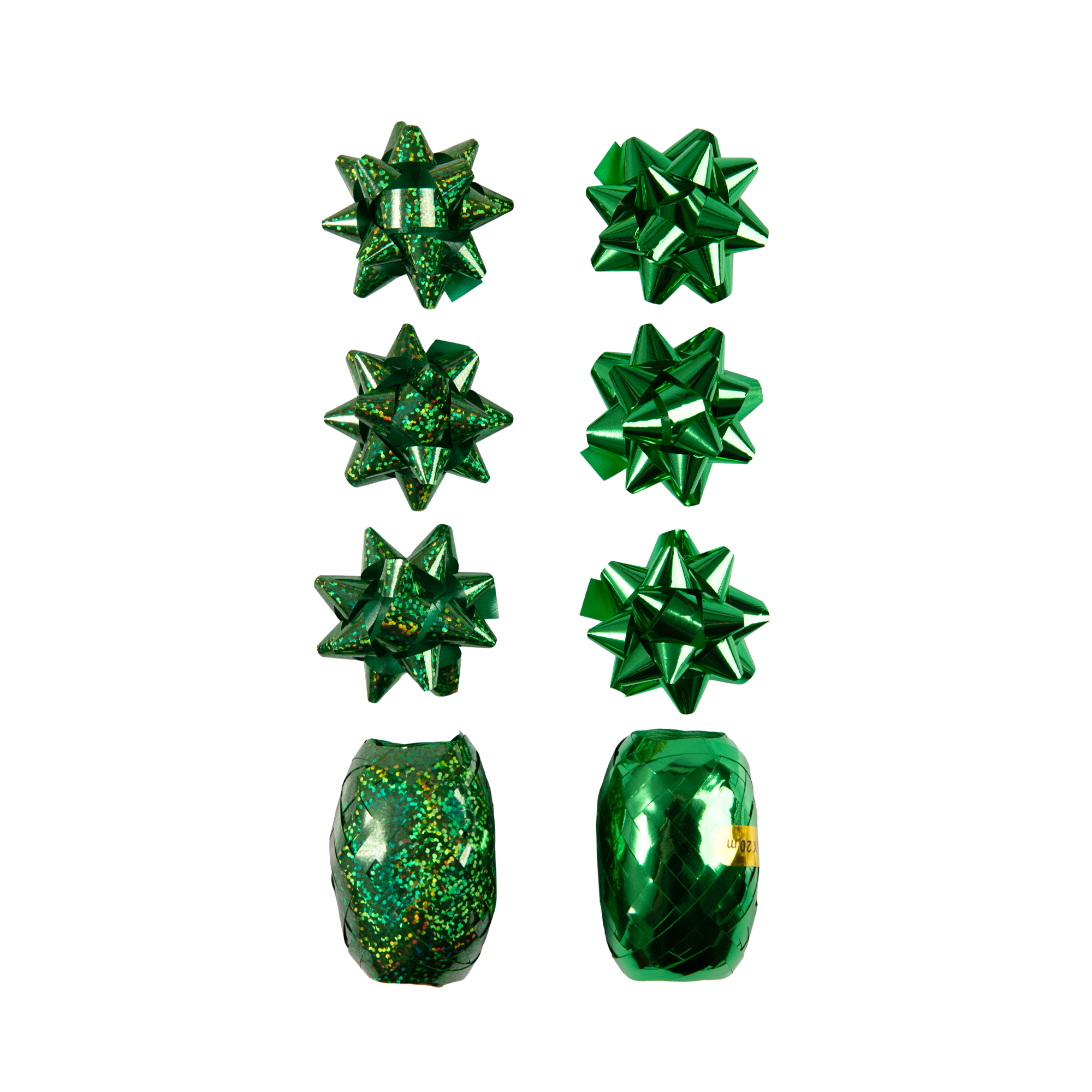 Chcete, aby vaše vánoční dárky vypadaly opravdu slavnostně? Tento zelený set ozdobného balení obsahuje vše, co potřebujete – vázací stuhy ve vajíčku a nalepovací rozety, které hezky drží tvar. Kombinace metalické a holografické zelené barvy pro dokonale sladěné Vánoce. Balení obsahuje: 3 metalické kokardy, 3 holografické kokardy, 1 metalickou stuhu a 1 holografickou stuhu. Šířka stuhy: 5 mm Délka stuhy: 2 × 20 m Průměr kokardy: 5 cm