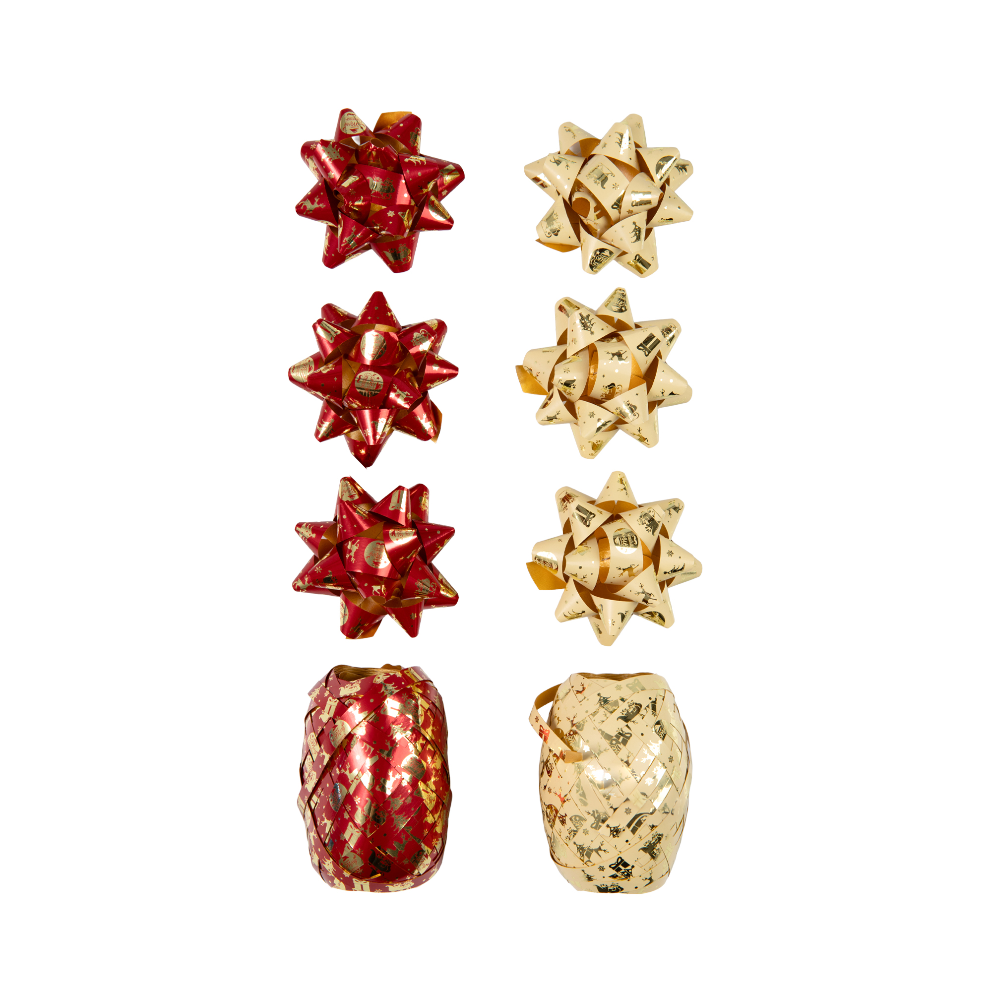 Chcete, aby vaše vánoční dárky vypadaly opravdu slavnostně? Tento set ozdobného balení obsahuje vše, co potřebujete – vázací stuhy ve vajíčku a kokardy s vánočním potiskem. Kombinace červené a zlaté barvy pro dokonale sladěné Vánoce. Balení obsahuje: 3 zlaté kokardy, 3 červené kokardy, 1 zlatou stuhu a 1 červenou stuhu. Šířka stuhy: 5 mm Délka stuhy: 2 × 20 m Průměr kokardy: 5 cm