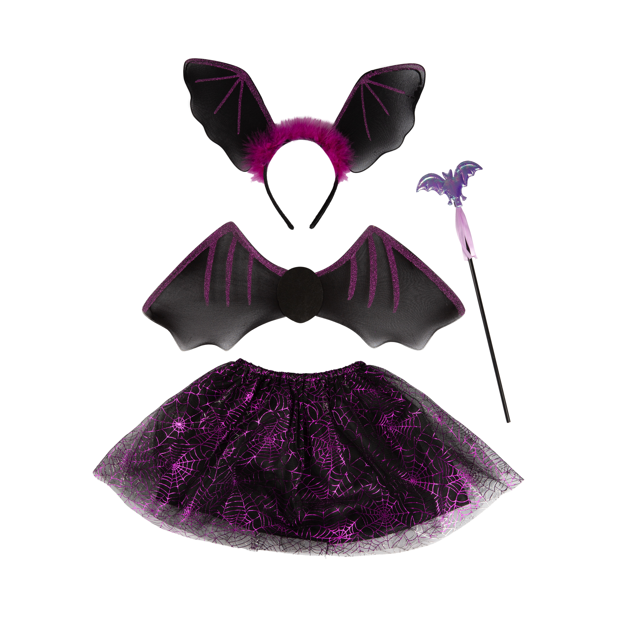 Set doplňků k dotvoření kostýmu netopýra, obsahuje 4 kusy a je dostupný ve velikostech 3-4 roky a 4-6 let. Perfektní volba na tematickou párty, karneval nebo Halloween! Tento dětský set je laděný do černé, fialové a růžové barvy a obsahuje čelenku s ušima, hůlku s netopýrem, křídla a tylovou sukni s potiskem pavučin. Pro další dekorace a kostýmové doplňky se strašidelným motivem můžete prozkoumat naši kategorii Halloween. Velikosti: 3-4 roky a 4-6 let Materiál: 100% polyester Balení obsahuje: čelenku, hůlku, křídla a sukni Nevhodné pro děti do 3 let.