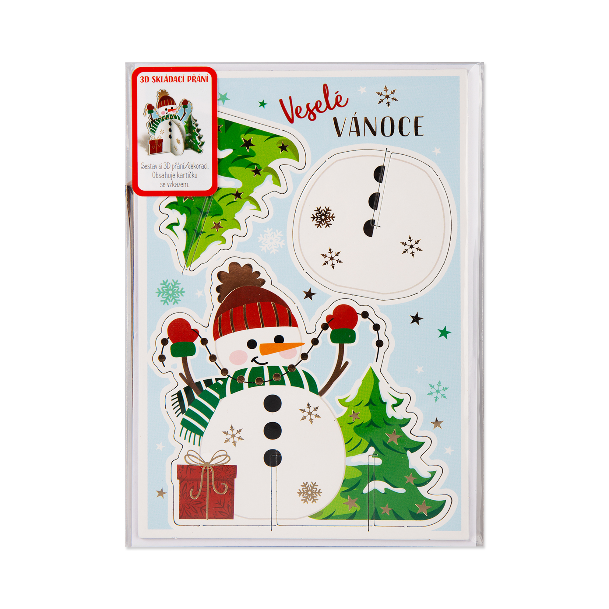 Překvapte na Vánoce své blízké netradičním skládacím přáním, ze kterého se dá jednoduše vytvořit 3D vánoční dekorace. Přání z tvrdého kartonu s motivem roztomilého sněhuláka si může obdarovaný snadno přetvořit v originální 3D dekoraci, která mu bude připomínat, že na něj myslíte. Vánoční 3D přání – Sněhulák navíc obsahuje kartičku s textem "Radostný a krásný ať je tento sváteční čas a vyplní se tajná přání každému z nás!" a bílou obálku, ve které můžete přáníčko poslat. Rozměry složeného přání: 11,5 × 17 cm