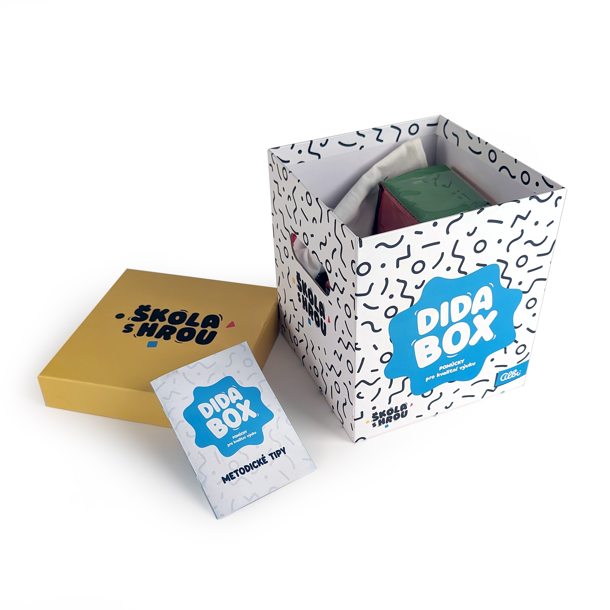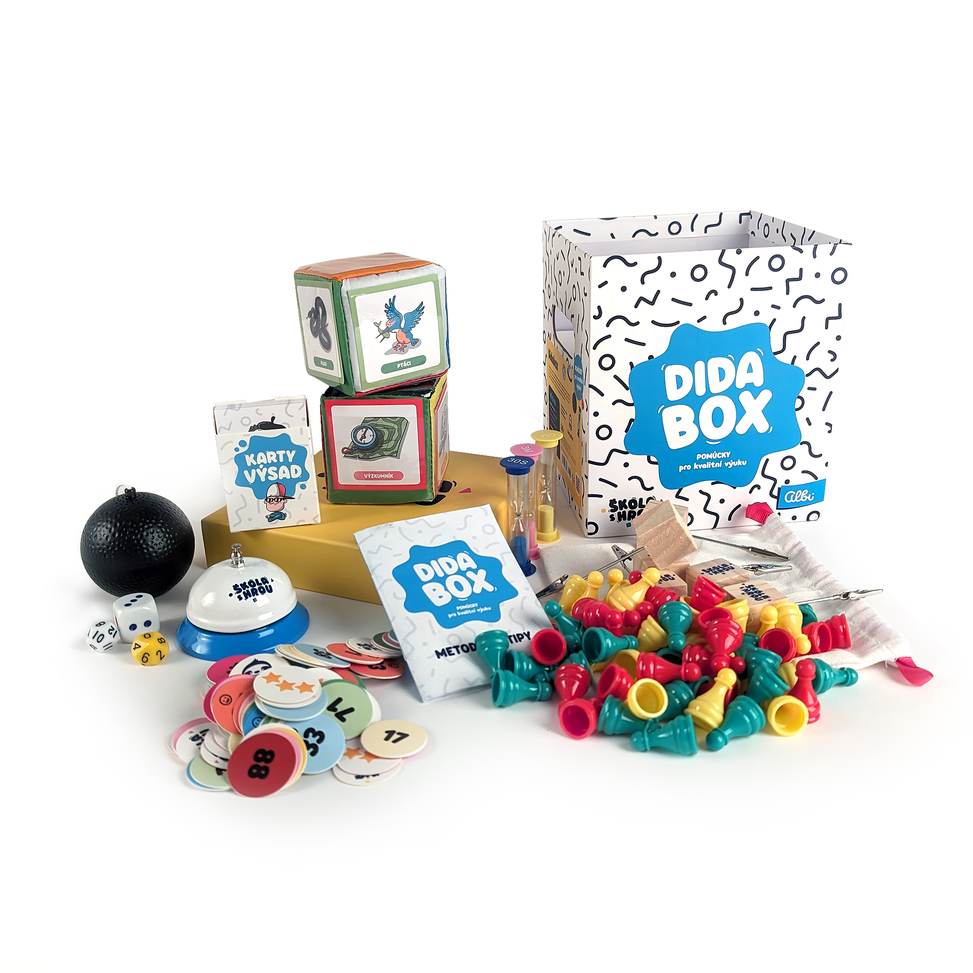 Didabox z edice Škola s hrou obsahuje edukační nástroje pro pedagogy, které povýší jejich práci na pedagogické mistrovství! V boxu učtitelé najdou 10 kvalitních didaktických pomůcek a brožuru metodických tipů do své praxe. Jedna z neaktraktivějších pomůcek mezi žáky patří bomba se zvukový signálem exploze, který se spouští v náhodném časovém intervalu. Mezi další unikáty patří karty výsad, které umožňují učiteli zábavným způsobem odměnit žáky. V balení nechybí ani klasické přesýpací hodiny na měření času, tříbarevné figurky v barvách semaforu, měkké losovací kostky s vyměnitelnými kartičkami nebo třeba žetony s losovacím pytlíkem a hlavně návod s tipy, jak konkrétně lze pomůcky využít. Pomůcky na podporu kvalitní didaktiky jsou určeny pro učitele základních a středních škol. Vyrobeno ve spolupráci s Líným učitelem. Rozměry: 19,5 × 19,5 × 23 cm Didabox obsahuje: brožuru s metodickými tipy a 10 didaktických pomůcek: karty výsad, přesýpací hodiny, losovací sáček, 100 žetonů, tikající bombu, zvonek, vícestěnné kostky, kostky s transparentními kapsami, holdery s klipem a figurky zpětné vazby. Do tikající bomby je třeba zakoupit 2 mikrotužkové AAA baterie, které nejsou součástí balení. NÁVOD NA VÝMĚNU BATERIÍ – TIKAJÍCÍ BOMBA Při výměně baterií odšroubujte šroubek (2) na víčku spodní strany bomby. Víčko sejměte – mírným tlakem zvedněte víčko nad pevnou plastovou pojistku (3). Otevřete přihrádku a vyměňte baterie pod tlačítkem zapnutí/vypnutí (1) – dbejte na dodržení správné polarizace (4). Poté nasaďte víčko přihrádky na baterie zpět a utáhněte pojistný šroubek (2). Přitom je třeba respektovat níže uvedené bezpečnostní pokyny. Nabíjejte pouze baterie určené k dobíjení. Používejte jen 1,5V AAA baterie doporučeného typu. Nepoužívejte baterie různého původu a značek. Nekombinujte použité a nové baterie. Ujistěte se, že baterie jsou vloženy dle návodu na obrázku. Za žádných okolností se nesnažte měnit elektrické obvody zařízení. Výměnu baterií mohou provádět pouze dospělé osoby.