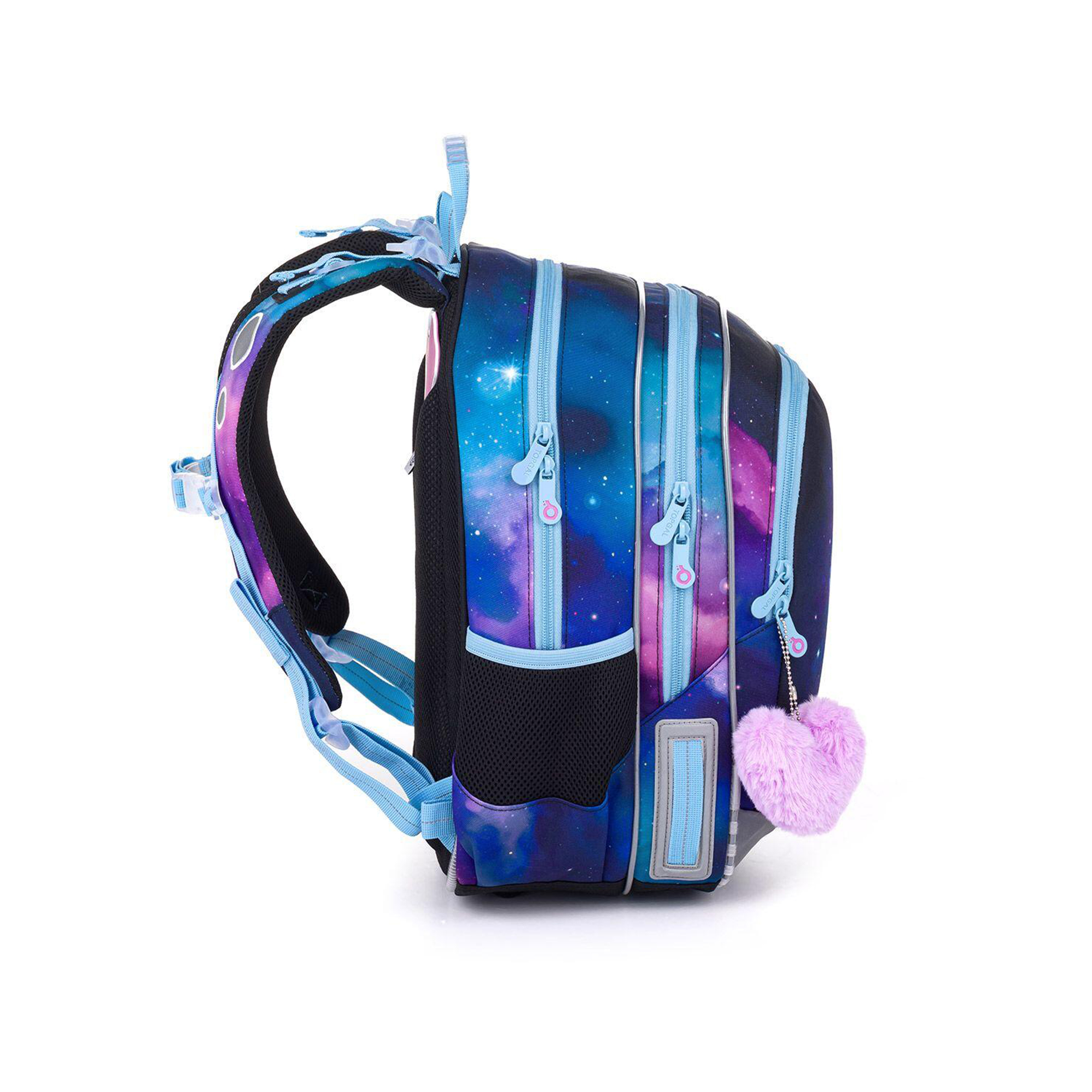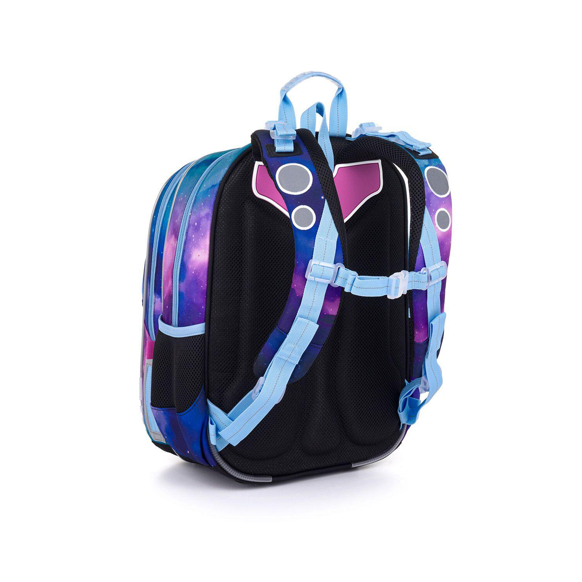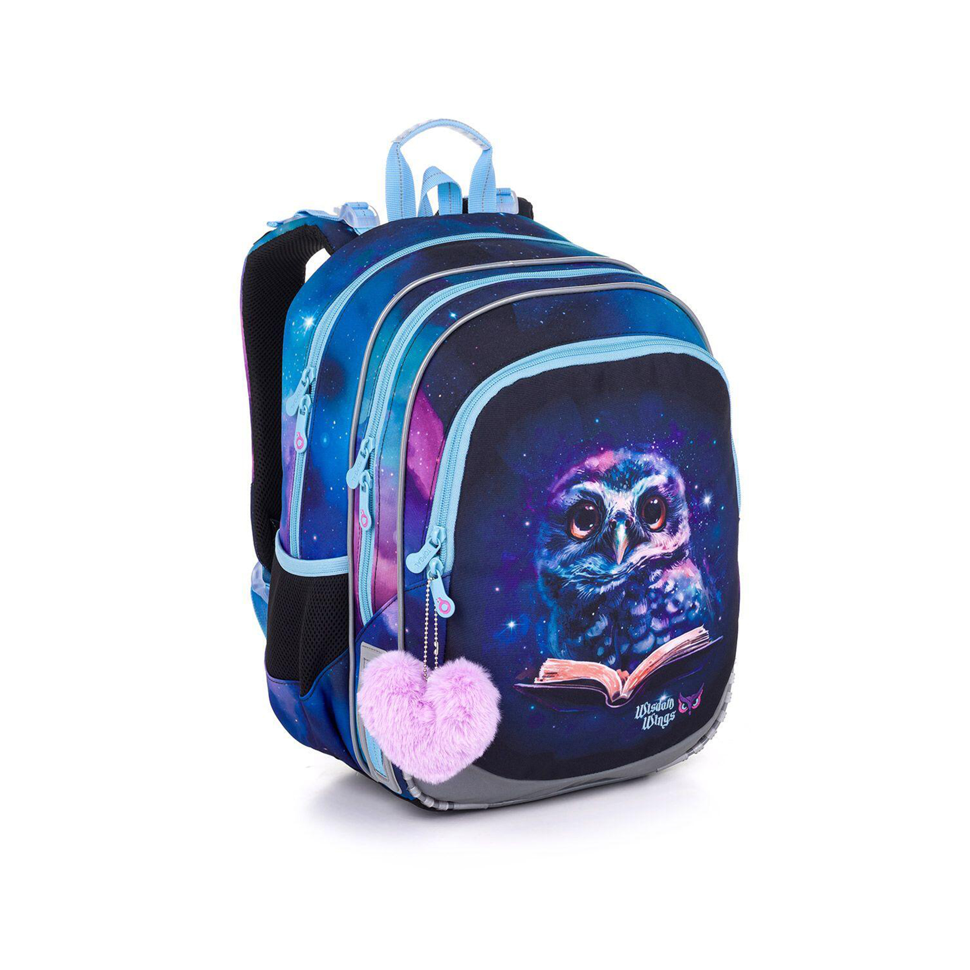 Lehký školní batoh ELLY je ideální volbou pro malé slečny od 1. do 4. třídy ZŠ s výškou od 115 cm. Aktovka okouzlí nejen svým vesmírným vzhledem, ale také motivem sovy s knihou. Vnitřek batohu je ozdoben růžovým pozadí s jahodami. Zip přední kapsy je pak ozdoben růžovou chlupatou klíčenkou ve tvaru srdce. Batoh váží pouhých 0,9 kg, takže nezatěžuje záda. Má 2 hlavní prostorné komory – zadní je ideální na učebnice a sešity, druhá, která je o něco menší, schovává jmenovku a síťovou kapsu na zip. Do hluboké přední kapsy se bez problémů vejde školní penál, případně krabička na svačinu či jiné drobnosti. Najdete v ní i odnímatelnou karabinu na klíče, takže už žádné zdlouhavé hledání. Do bočních kapes pak snadno uložíte láhev o objemu 0,5 l. Pro pohodlí a zdravé nošení je batoh osazen pevnými lisovanými zády, nastavitelnými ramenními popruhy a výškově nastavitelnou hrudní přezkou. Ramenní popruhy mají navíc magnetky, které udrží jejich volné konce na místě. Nechybí ani 2 poutka pro zavěšení na lavici a pohodlné přenášení v ruce. Bezpečnost dětí zajišťují reflexní prvky na bocích, čele i popruzích. spodní část batohu chrání pevné, nepropustné dno, které zvyšuje odolnost v každodenním používání. Školní aktovka je vyrobena z recyklovaného materiálu rPET českou firmou, má zátěr proti dešti a byla testována v ITC Zlín, takže splňuje náročné požadavky na kvalitu a ergonomii. Tento školní batoh je stylový, lehký, bezpečný a praktický společník pro každou malou školačku. Parametry produktu Hmotnost: 0,9 kg Rozměry: 30 × 41 × 21 cm Objem: 23 litrů Nosnost: 7 kg Materiál: 100% polyester