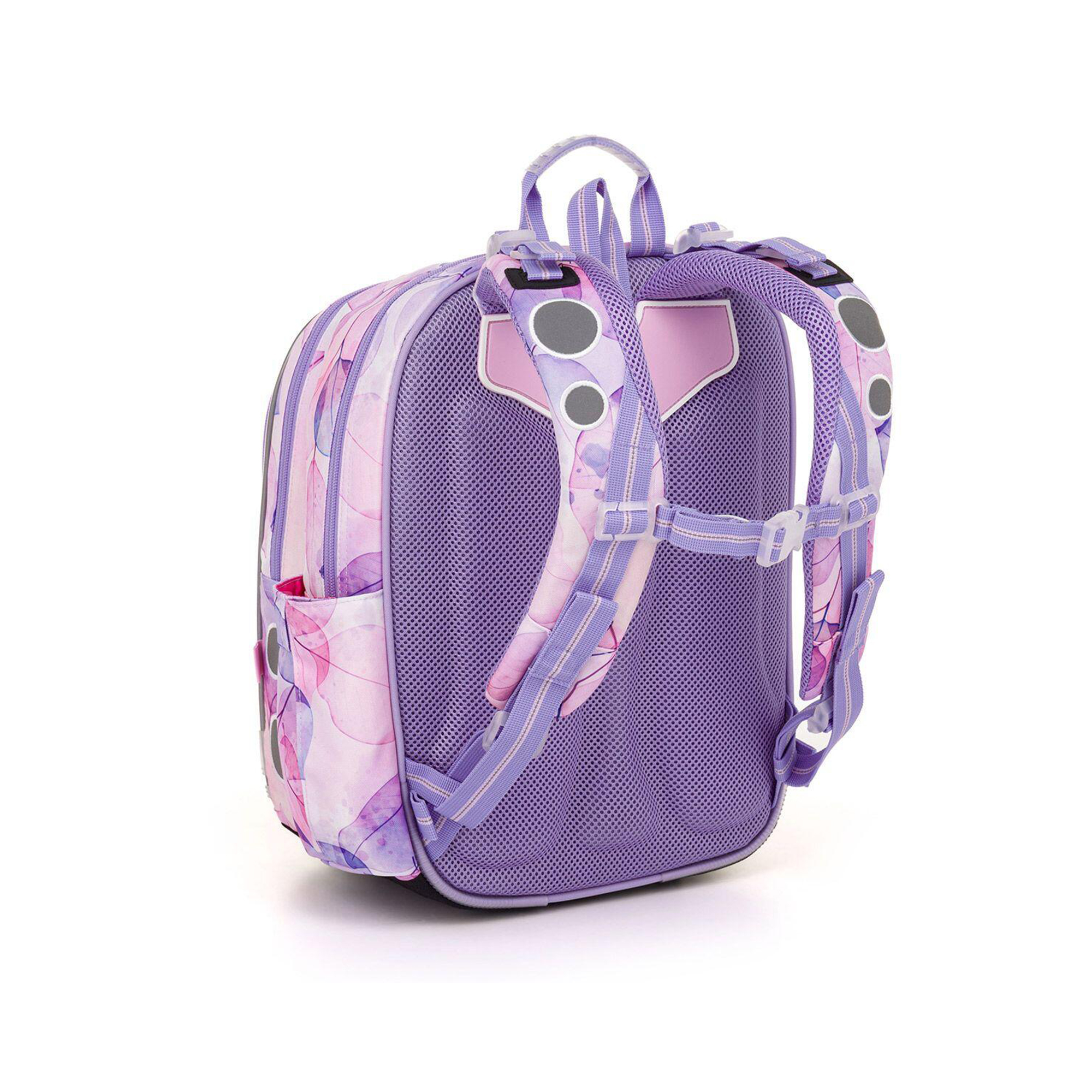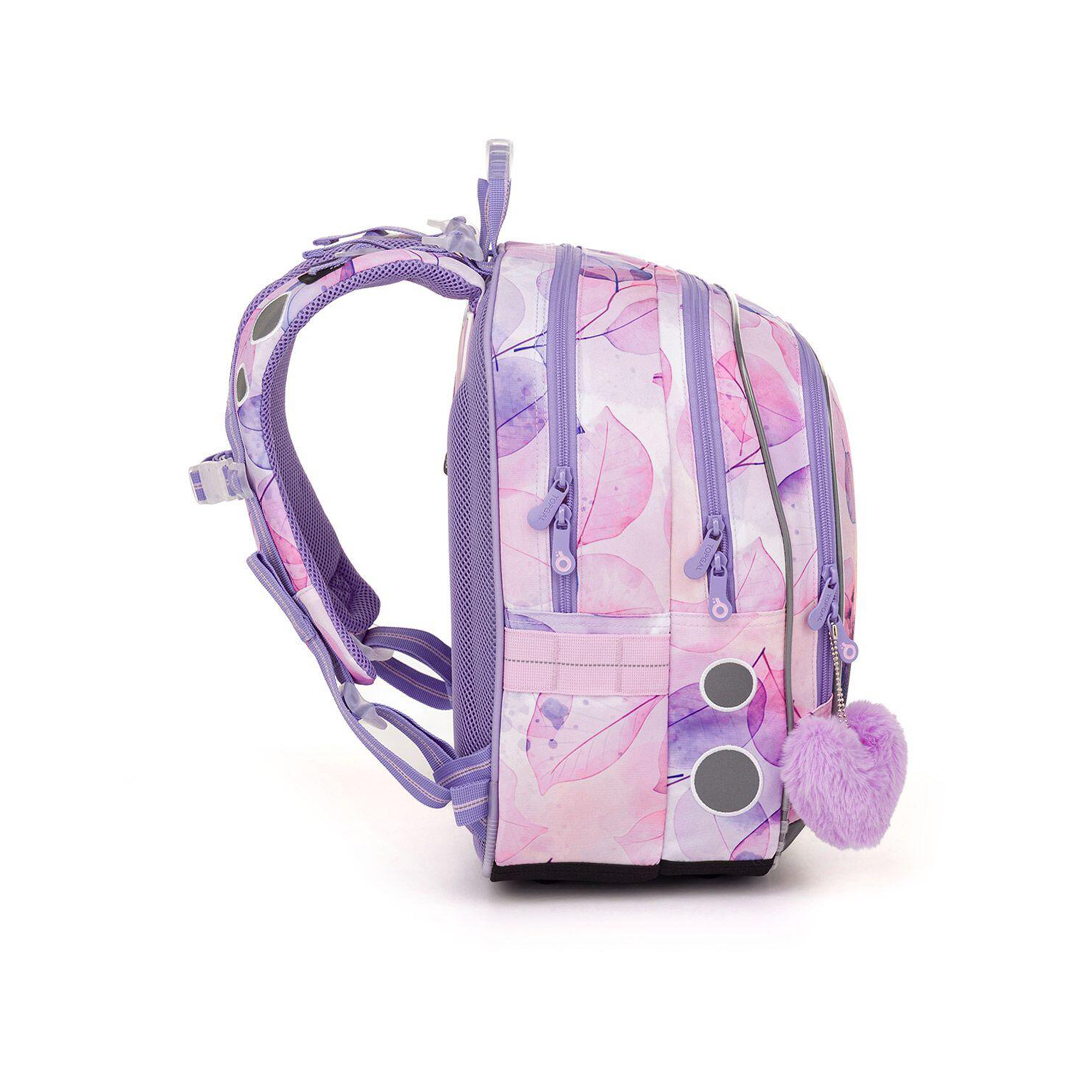 Lehký školní batoh ENDY je ideální volbou pro malé slečny od 1. do 3. třídy ZŠ s výškou od 110 cm. Aktovku zdobí motiv roztomilého koníka a fialovo růžových lístků. Zip přední kapsy s růžovým chlupatým přívěskem ve tvaru srdíčka doplňuje celkový styl batohu. Batoh váží pouhých 0,9 kg, takže nezatěžuje záda. Má 2 hlavní prostorné komory – zadní je ideální na učebnice a sešity, druhá, která je o něco menší, schovává jmenovku a síťovou kapsu na zip. Do hluboké přední kapsy se bez problémů vejde školní penál, případně krabička na svačinu či jiné drobnosti. Najdete v ní i odnímatelnou karabinu na klíče, takže už žádné zdlouhavé hledání. Do bočních kapes pak snadno uložíte láhev o objemu 0,5 l. Pro pohodlí a zdravé nošení je batoh osazen pevnými lisovanými zády, nastavitelnými ramenními popruhy a výškově nastavitelnou hrudní přezkou. Ramenní popruhy mají navíc magnetky, které udrží jejich volné konce na místě. Nechybí ani 2 poutka pro zavěšení na lavici a pohodlné přenášení v ruce. Bezpečnost dětí zajišťují reflexní prvky na bocích, čele i popruzích. Spodní část batohu chrání pevné, nepropustné dno s nožičkami, které zvyšuje odolnost v každodenním používání. Školní aktovka je vyrobena z recyklovaného materiálu rPET českou firmou, má zátěr proti dešti a byla testována v ITC Zlín, takže splňuje náročné požadavky na kvalitu a ergonomii. Tento školní batoh je stylový, lehký, bezpečný a praktický společník pro každou malou školačku. Parametry produktu Hmotnost: 0,9 kg Rozměry: 28 × 39 × 19 cm Objem: 21 litrů Nosnost: 7 kg Materiál: 100% polyester