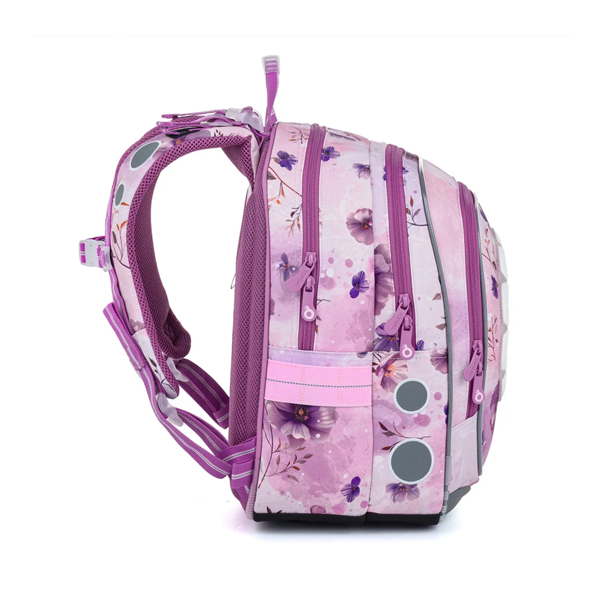 Lehký školní batoh ENDY je ideální volbou pro malé slečny od 1. do 3. třídy ZŠ. Aktovku s růžovým podkladem a květinovými motivy zdobí kouzelná víla s malým králíčkem v náručí. Eleganci batohu doplňuje flitrový přívěsek ve tvaru motýla, který dodává celému designu hravý nádech. Díky vyměnitelným obrázkům s vílami můžete mít každý den jiný batoh. Batoh váží pouhých 0,9 kg, takže nezatěžuje záda. Má 2 hlavní prostorné komory a 1 přední kapsu. Zadní komora je ideální na učebnice a sešity, druhá, která je o něco menší, schovává jmenovku a síťovou kapsu na zip. Do hluboké přední kapsy se bez problémů vejde školní penál, případně krabička na svačinu či jiné drobnosti. Najdete v ní i odnímatelnou karabinu na klíče, takže už žádné zdlouhavé hledání. Do bočních kapes pak snadno uložíte láhev o objemu 0,5 l. Pro pohodlí a zdravé nošení je batoh osazen pevnými lisovanými zády, nastavitelnými ramenními popruhy a výškově nastavitelnou hrudní přezkou. Ramenní popruhy mají navíc magnetky, které udrží jejich volné konce na místě. Nechybí ani 2 poutka pro zavěšení na lavici a pohodlné přenášení v ruce. Bezpečnost dětí zajišťují reflexní prvky na bocích, čele i popruzích. Spodní část batohu chrání pevné, nepropustné dno s nožičkami, které zvyšuje odolnost v každodenním používání. Školní aktovka je vyrobena z recyklovaného materiálu rPET českou firmou, má zátěr proti dešti a byla testována v ITC Zlín, takže splňuje náročné požadavky na kvalitu a ergonomii. Tento školní batoh je stylový, lehký, bezpečný a praktický společník pro každou malou školačku. Parametry produktu Hmotnost: 0,9 kg Rozměry: 28 × 39 × 19 cm Objem: 21 litrů Nosnost: 7 kg Materiál: 100% polyester