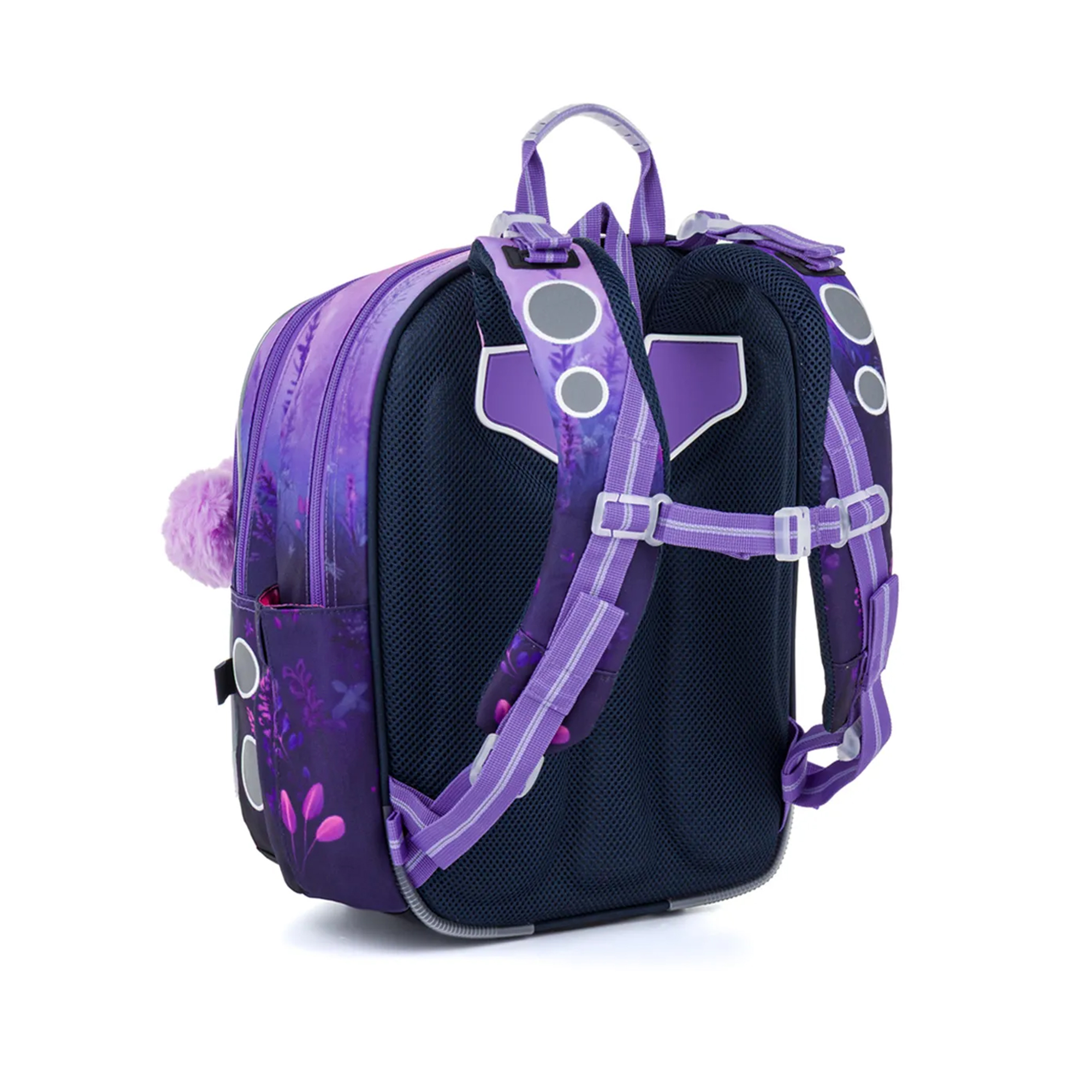 Lehký školní batoh ENDY je ideální volbou pro malé slečny od 1. do 3. třídy ZŠ. Aktovku s motivem kouzelného králíčka a nápis Follow the Bunny potěší každou holčičku. Eleganci batohu doplňují fialové detaily a růžový přívěsek ve tvaru srdce, který dodává celému designu hravý nádech. Batoh váží pouhých 0,9 kg, takže nezatěžuje záda. Má 2 hlavní prostorné komory – zadní je ideální na učebnice a sešity. Do hluboké přední kapsy se bez problémů vejde školní penál, případně krabička na svačinu či jiné drobnosti. Najdete v ní i odnímatelnou karabinu na klíče, takže už žádné zdlouhavé hledání. Do bočních kapes pak snadno uložíte láhev o objemu 0,5 l. Pro pohodlí a zdravé nošení je batoh osazen pevnými lisovanými zády, nastavitelnými ramenními popruhy a výškově nastavitelnou hrudní přezkou. Ramenní popruhy mají navíc magnetky, které udrží jejich volné konce na místě. Nechybí ani 2 poutka pro zavěšení na lavici a pohodlné přenášení v ruce. Bezpečnost dětí zajišťují reflexní prvky na bocích, čele i popruzích. Spodní část batohu chrání pevné, nepropustné dno s nožičkami, které zvyšuje odolnost v každodenním používání. Školní aktovka je vyrobena z recyklovaného materiálu rPET českou firmou, má zátěr proti dešti a byla testována v ITC Zlín, takže splňuje náročné požadavky na kvalitu a ergonomii. Tento školní batoh je stylový, lehký, bezpečný a praktický společník pro každou malou školačku. Parametry produktu Hmotnost: 0,9 kg Rozměry: 28 × 39 × 19 cm Objem: 21 litrů Nosnost: 7 kg Materiál: 100% polyester