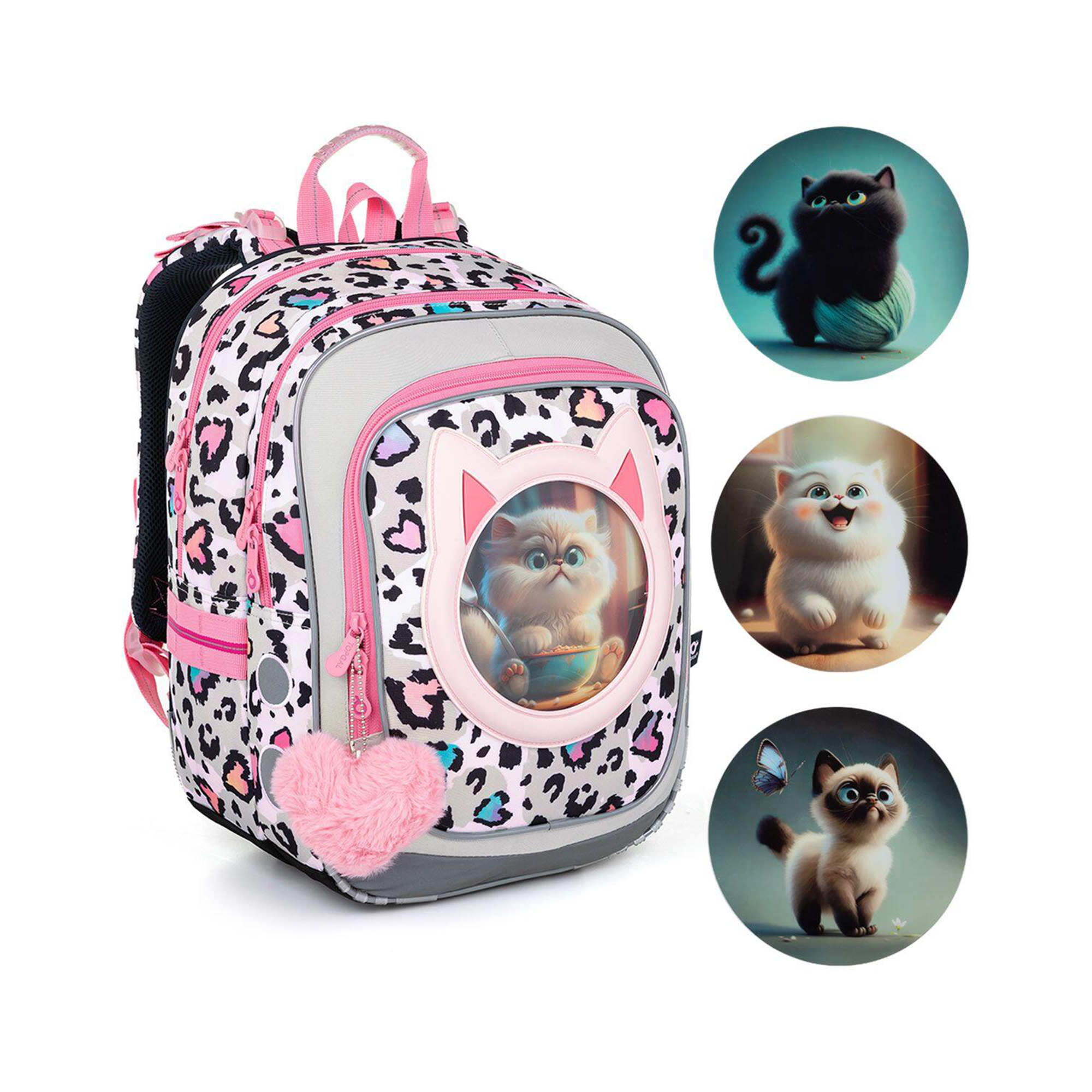 Lehký školní batoh ENDY je ideální volbou pro malé slečny od 1. do 3. třídy ZŠ s výškou od 110 cm. Aktovka zaujme srdíčkovým leopardím vzorem. Na přední kapse najdete kulaté okénko s kočičími uši. Součástí jsou 4 vyměnitelné obrázky koťátek, které lze do kulatého okénka vložit a zazářit tak každý den s originálním batohem. Zip přední kapsy zdobí chlupatý růžový přívěsek ve tvaru srdce, který doplňuje celkový styl batohu. Batoh váží pouhých 0,9 kg, takže nezatěžuje záda. Má 2 hlavní prostorné komory – zadní je ideální na učebnice a sešity, druhá, která je o něco menší, schovává jmenovku a síťovou kapsu na zip. Do hluboké přední kapsy se bez problémů vejde školní penál, případně krabička na svačinu či jiné drobnosti. Najdete v ní i odnímatelnou karabinu na klíče, takže už žádné zdlouhavé hledání. Do bočních kapes pak snadno uložíte láhev o objemu 0,5 l. Pro pohodlí a zdravé nošení je batoh osazen pevnými lisovanými zády, nastavitelnými ramenními popruhy a výškově nastavitelnou hrudní přezkou. Ramenní popruhy mají navíc magnetky, které udrží jejich volné konce na místě. Nechybí ani 2 poutka pro zavěšení na lavici a pohodlné přenášení v ruce. Bezpečnost dětí zajišťují reflexní prvky na bocích, čele i popruzích. Spodní část batohu chrání pevné, nepropustné dno s nožičkami, které zvyšuje odolnost v každodenním používání. Školní aktovka je vyrobena z recyklovaného materiálu rPET českou firmou, má zátěr proti dešti a byla testována v ITC Zlín, takže splňuje náročné požadavky na kvalitu a ergonomii. Tento školní batoh je stylový, lehký, bezpečný a praktický společník pro každou malou školačku. Parametry produktu Hmotnost: 0,9 kg Rozměry: 28 × 39 × 19 cm Objem: 21 litrů Nosnost: 7 kg Materiál: 100% polyester