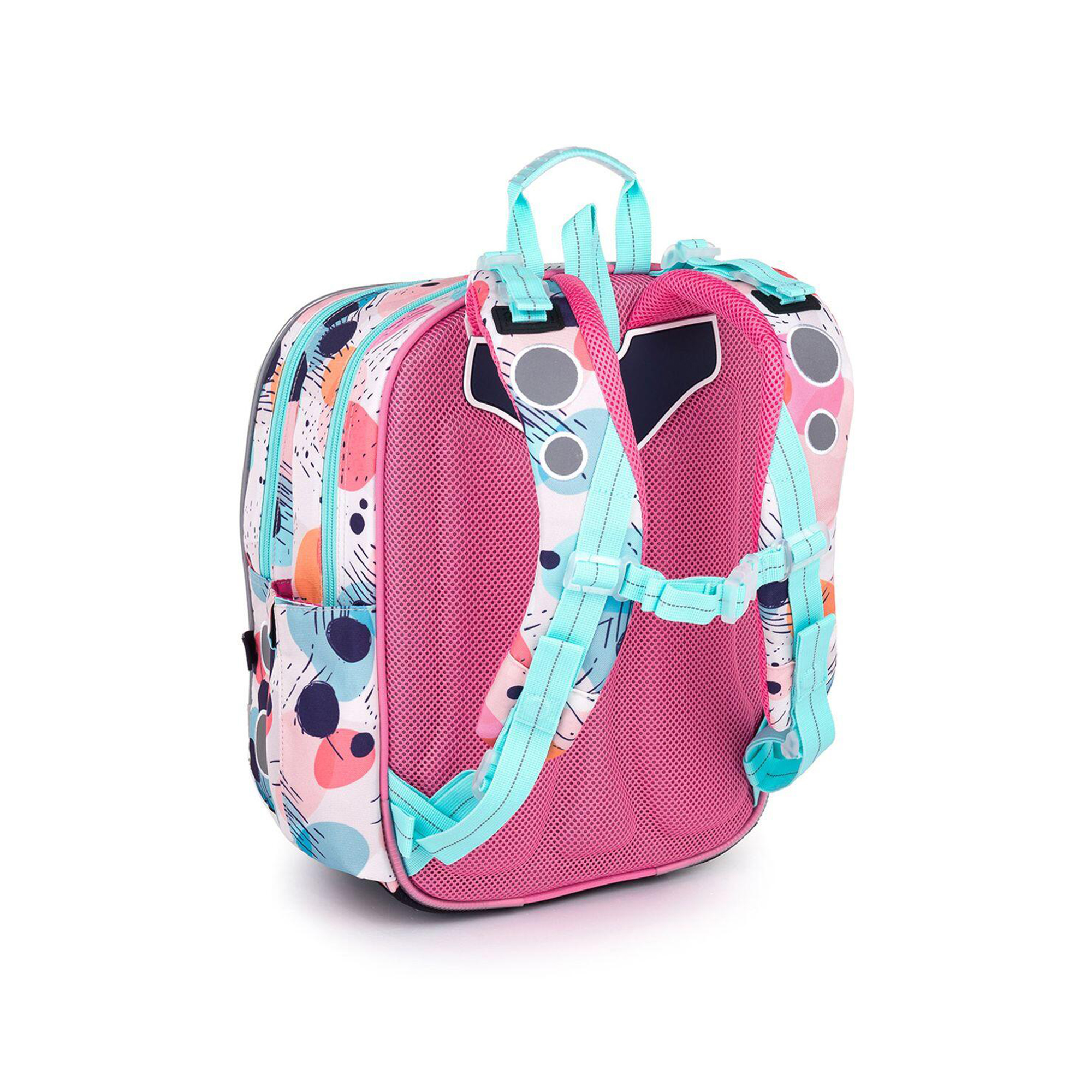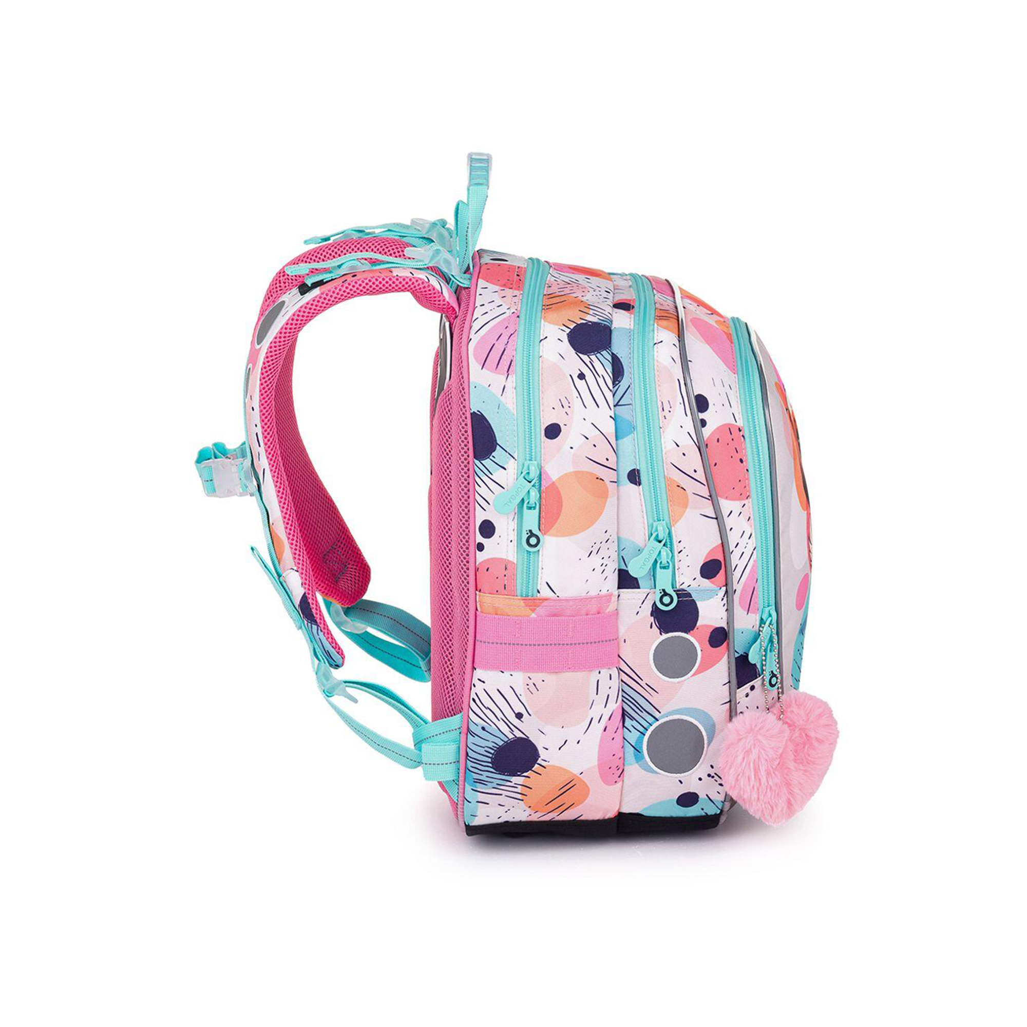 Lehký školní batoh ENDY je ideální volbou pro malé slečny od 1. do 3. třídy ZŠ s výškou od 110 cm. Aktovku zdobí roztomilý motiv pejska a nápis Dog Mom potěší všechny nadšené pejskařky. Veselé pastelové barvy a růžový chlupatý přívěsek ve tvaru srdce dotváří celkový jemný dojem. Batoh váží pouhých 0,9 kg, takže nezatěžuje záda. Má 2 hlavní prostorné komory – zadní je ideální na učebnice a sešity, druhá, která je o něco menší, schovává jmenovku a síťovou kapsu na zip. Do hluboké přední kapsy se bez problémů vejde školní penál, případně krabička na svačinu či jiné drobnosti. Najdete v ní i odnímatelnou karabinu na klíče, takže už žádné zdlouhavé hledání. Do bočních kapes pak snadno uložíte láhev o objemu 0,5 l. Pro pohodlí a zdravé nošení je batoh osazen pevnými lisovanými zády, nastavitelnými ramenními popruhy a výškově nastavitelnou hrudní přezkou. Ramenní popruhy mají navíc magnetky, které udrží jejich volné konce na místě. Nechybí ani 2 poutka pro zavěšení na lavici a pohodlné přenášení v ruce. Bezpečnost dětí zajišťují reflexní prvky na bocích, čele i popruzích. Spodní část batohu chrání pevné, nepropustné dno s nožičkami, které zvyšuje odolnost v každodenním používání. Školní aktovka je vyrobena z recyklovaného materiálu rPET českou firmou, má zátěr proti dešti a byla testována v ITC Zlín, takže splňuje náročné požadavky na kvalitu a ergonomii. Tento školní batoh je stylový, lehký, bezpečný a praktický společník pro každou malou školačku. Parametry produktu Hmotnost: 0,9 kg Rozměry: 28 × 39 × 19 cm Objem: 21 litrů Nosnost: 7 kg Materiál: 100% polyester