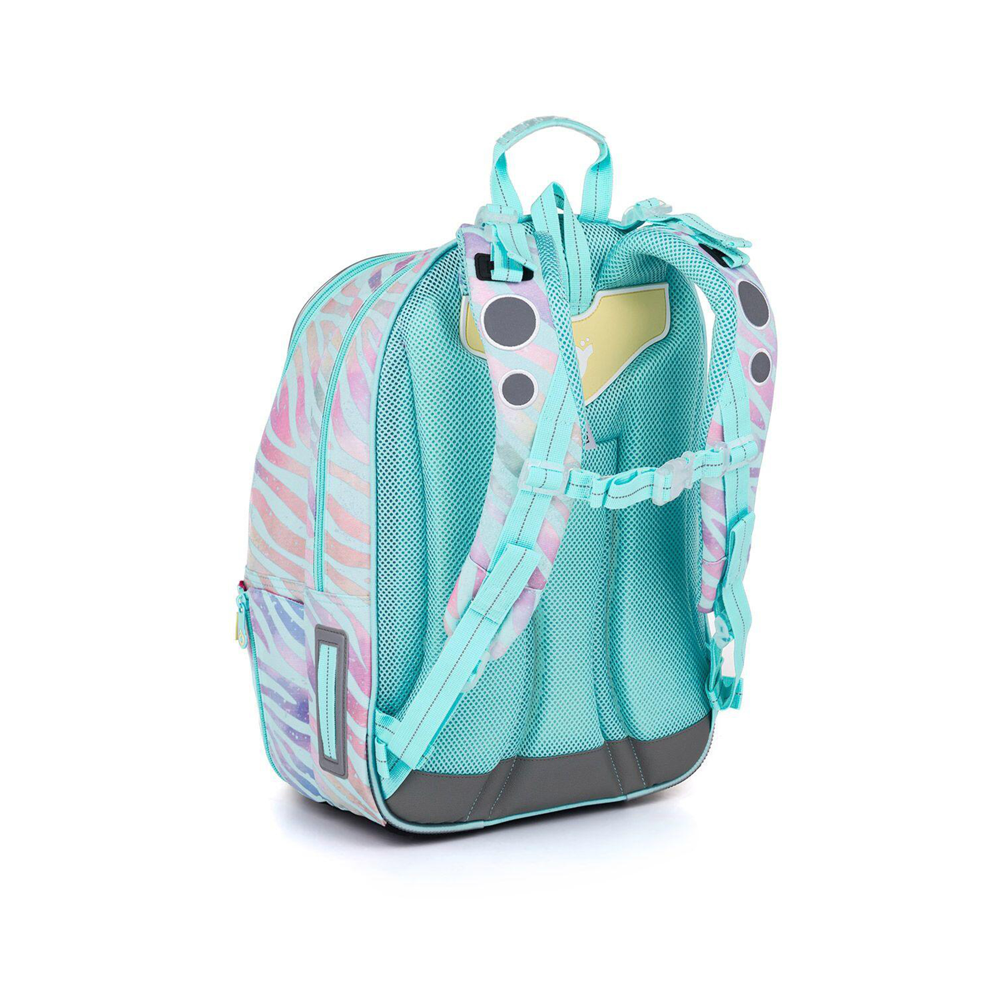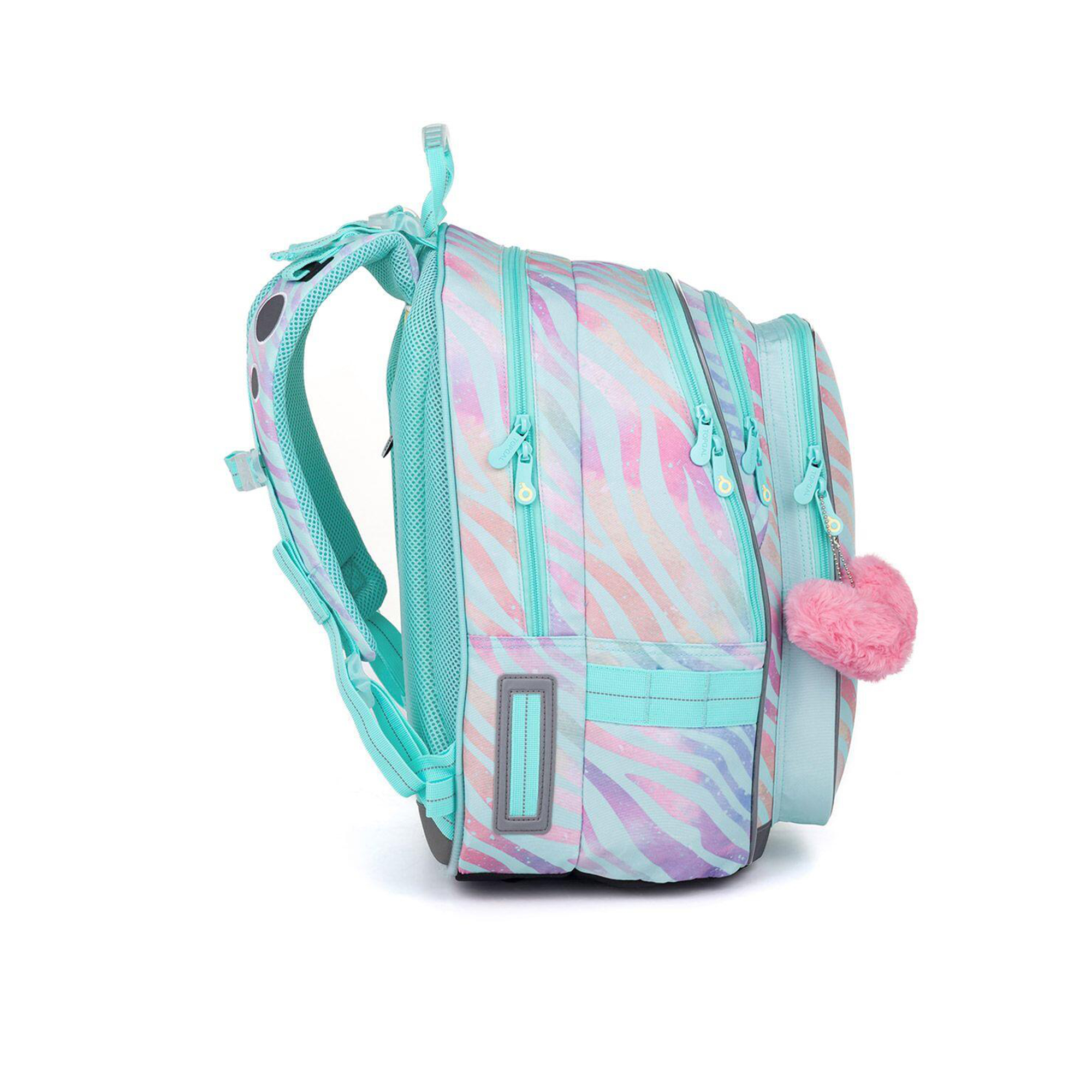 Školní batoh LYNN je ideální volbou pro děti od 3. do 5. třídy ZŠ s výškou od 125 cm. Světle tyrkysovou aktovku zdobí zebří pruhy s duhovým pozadí. Uvnitř batohu najdete motivy jahod na sytě růžovém pozadí. Celkový dojem dotváří růžový chlupatý přívěsek ve tvaru srdíčka. Batoh váží 1,10 kg a má 2 prostorné hlavní komory a 2 hluboké kapsy. Zadní komora pojme učebnice, sešity i další školní potřeby. Druhá komora obsahuje malou síťovanou kapsu na zip, kterou děti využijí na důležité věci, jako je třeba peněženka. Hluboká třetí kapsa obsahuje jmenovku a odjímatelnou karabinku na klíče – poslouží třeba na penál nebo svačinový box. Do přední hluboké kapsy si pak děti mohou uložit zbytek drobností, které by se jim ve škole mohly hodit. Boční kapsy pojmou láhve o objemu 0,5 l. Pro maximální pohodlí a ergonomii má batoh pevná anatomicky tvarovaná záda s hliníkovou výztuhou, nastavitelné ramenní popruhy a výškově nastavitelnou hrudní přezku. Ramenní popruhy jsou navíc opatřeny magnetkami, které udrží volné konce na místě. Nechybí ani 2 poutka na zavěšení batohu na lavici a pohodlné nošení i pevné dno s plastovými nožičkami. Bezpečnost dětí zajišťují reflexní prvky na bocích, čele i popruzích. Školní aktovka je vyrobena z recyklovaného materiálu rPET českou firmou, má zátěr proti dešti a byla testována v ITC Zlín, takže splňuje náročné požadavky na kvalitu a ergonomii. Tento školní batoh je stylový, bezpečný a praktický společník pro každou školačku. Parametry produktu Hmotnost: 1,10 kg Rozměry: 30 × 44 × 23 cm Objem: 27 litrů Nosnost: 7 kg Materiál: 100% polyester