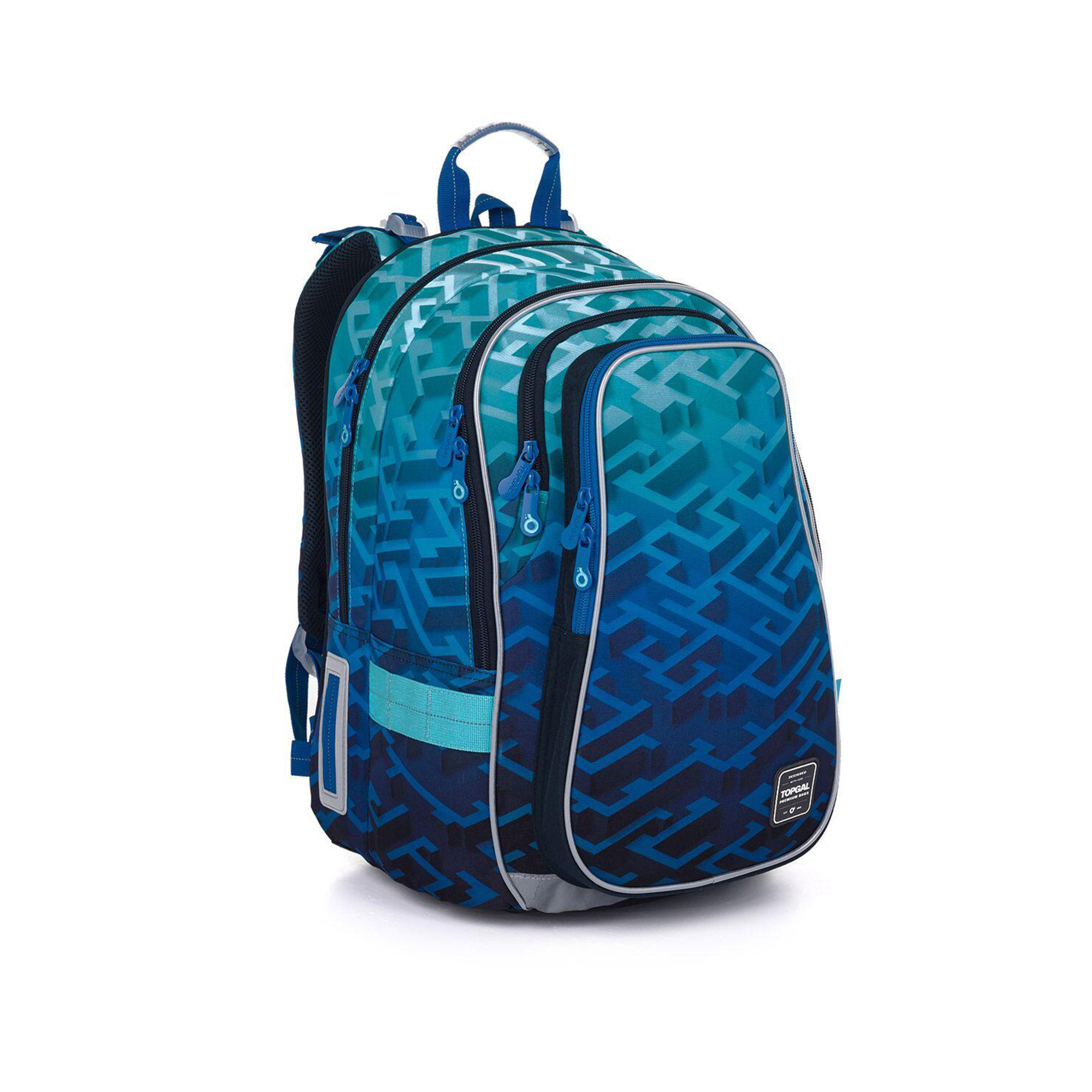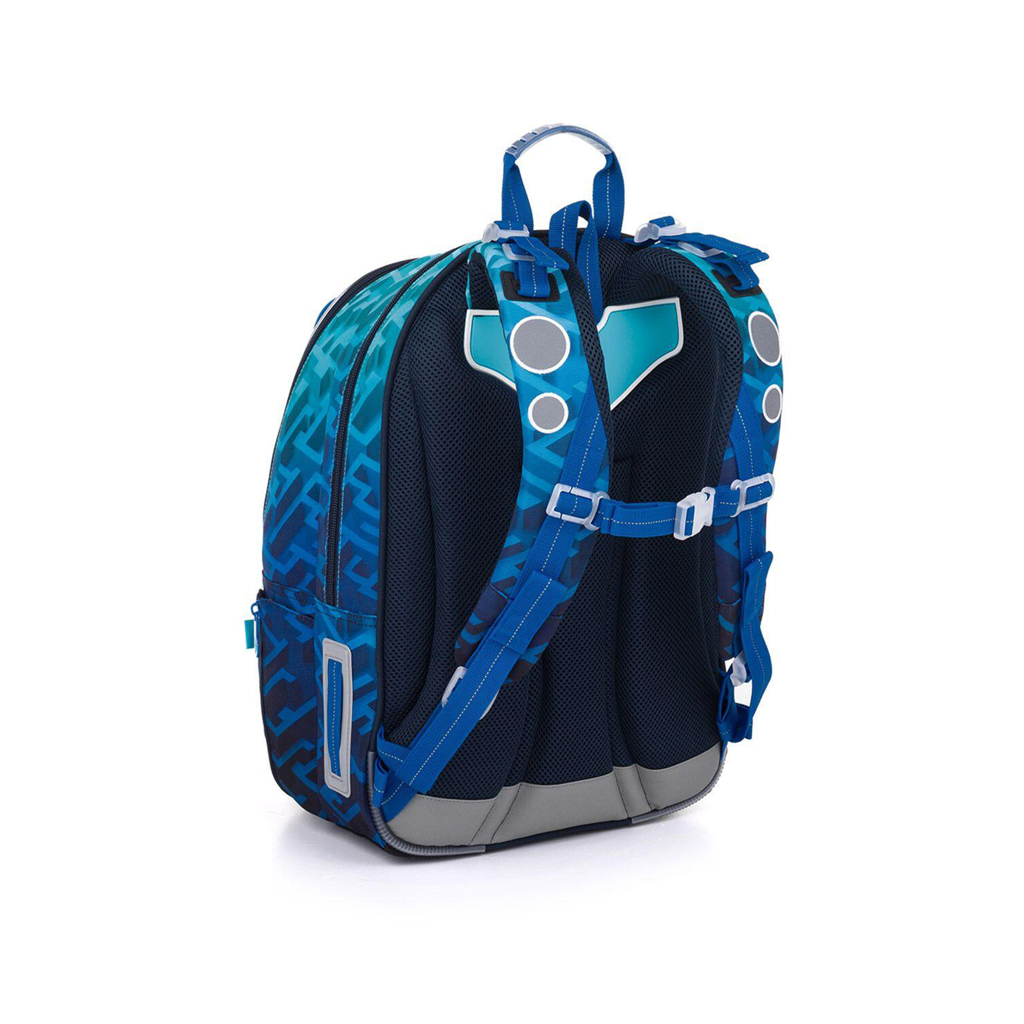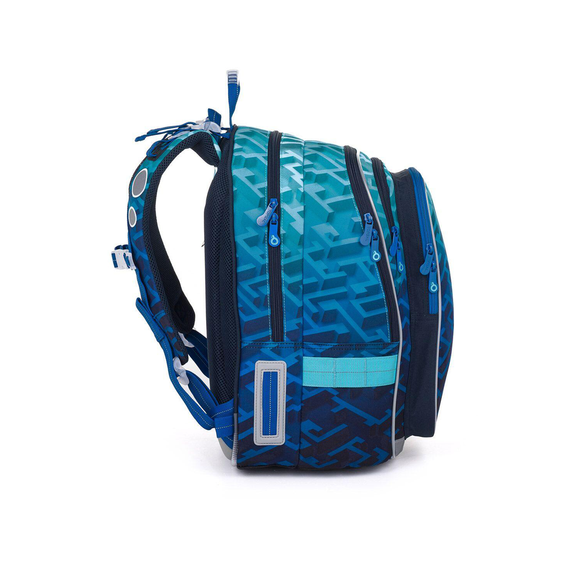 Školní batoh LYNN je ideální volbou pro děti od 3. do 5. třídy ZŠ s výškou od 125 cm. Modrá aktovka nese motiv bludiště. Uvnitř pak najdete různorodé světle modré motivy (auto, žraloka, skateboard, atd). Batoh váží 1,10 kg a má 2 prostorné hlavní komory a 2 hluboké kapsy. Zadní komora pojme učebnice, sešity i další školní potřeby. Druhá komora obsahuje malou síťovanou kapsu na zip, kterou děti využijí na důležité věci, jako je třeba peněženka. Hluboká třetí kapsa obsahuje jmenovku a odjímatelnou karabinku na klíče – poslouží třeba na penál nebo svačinový box. Do přední hluboké kapsy si pak děti mohou uložit zbytek drobností, které by se jim ve škole mohly hodit. Boční kapsy pojmou láhve o objemu 0,5 l. Pro maximální pohodlí a ergonomii má batoh pevná anatomicky tvarovaná záda s hliníkovou výztuhou, nastavitelné ramenní popruhy a výškově nastavitelnou hrudní přezku. Ramenní popruhy jsou navíc opatřeny magnetkami, které udrží volné konce na místě. Nechybí ani 2 poutka na zavěšení batohu na lavici a pohodlné nošení i pevné dno s plastovými nožičkami. Bezpečnost dětí zajišťují reflexní prvky na bocích, čele i popruzích. Školní aktovka je vyrobena z recyklovaného materiálu rPET českou firmou, má zátěr proti dešti a byla testována v ITC Zlín, takže splňuje náročné požadavky na kvalitu a ergonomii. Tento školní batoh je stylový, bezpečný a praktický společník pro každého školáka. Parametry produktu Hmotnost: 1,10 kg Rozměry: 30 × 44 × 23 cm Objem: 27 litrů Nosnost: 7 kg Materiál: 100% polyester