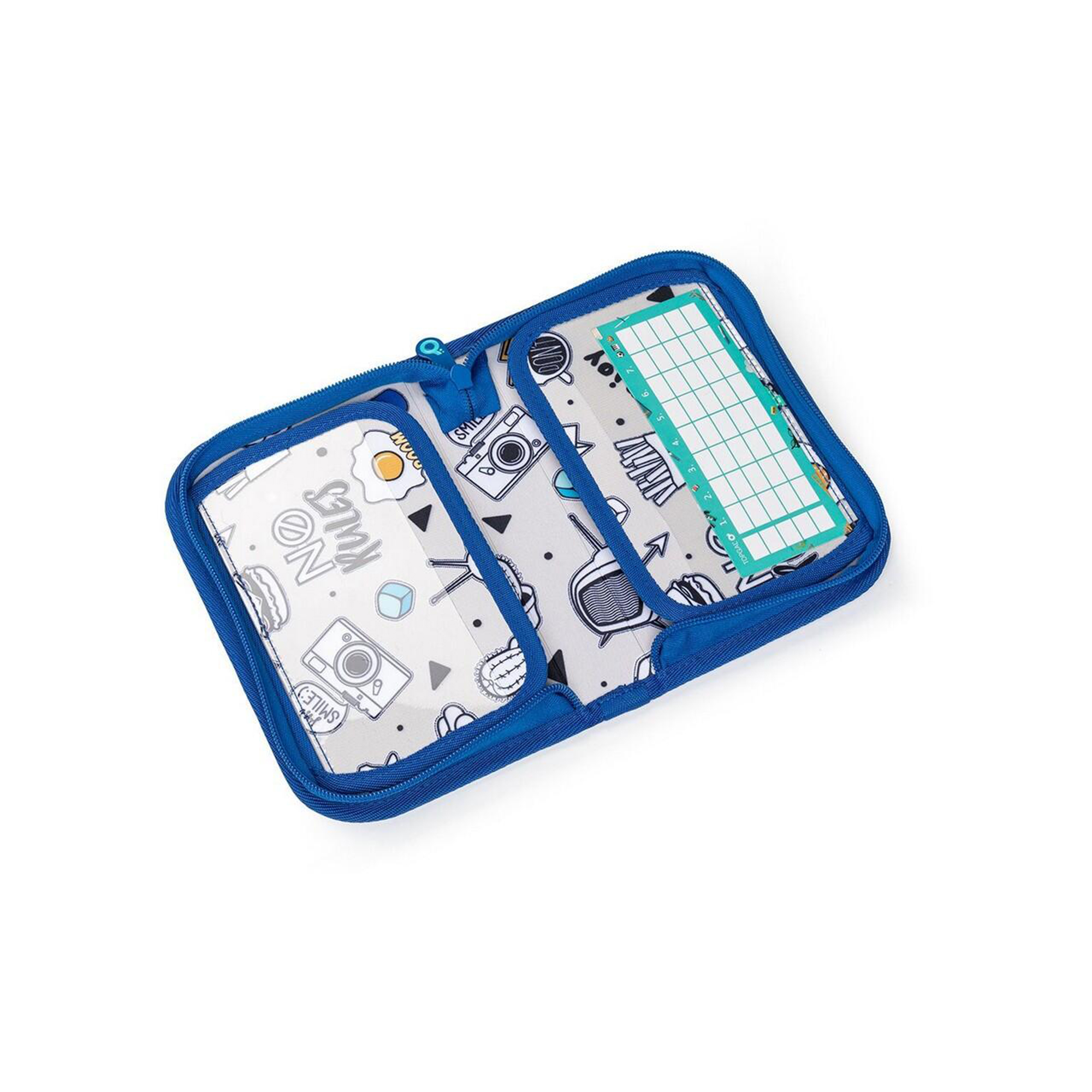 Stylový modrý jednopatrový penál s motivem fotbalového míče potěší všechny kluky, kteří chtějí mít přehled ve svých školních potřebách a zároveň milují kreativitu. Uvnitř se totiž nachází šedá podšívka s obrázky k vybarvení. Penál má 2 klopy a gumové úchyty pro 21 pastelek, tužek či fixů plus 3 širší místa na pravítko, kružítko nebo nůžky a 2 větší úchyty na gumu a ořezávátko. Pod průhlednou folií najdete rozvrh hodin, druhá kapsa na klopě může posloužit jako úložiště na poznámky. Polstrování chrání všechny potřeby, zipy s velkými taháčky usnadňují dětem manipulaci. Penál není vhodný do pračky. Parametry produktu Hmotnost: 200 g Rozměry: 21 × 5 × 14 cm Materiál: 100% polyester