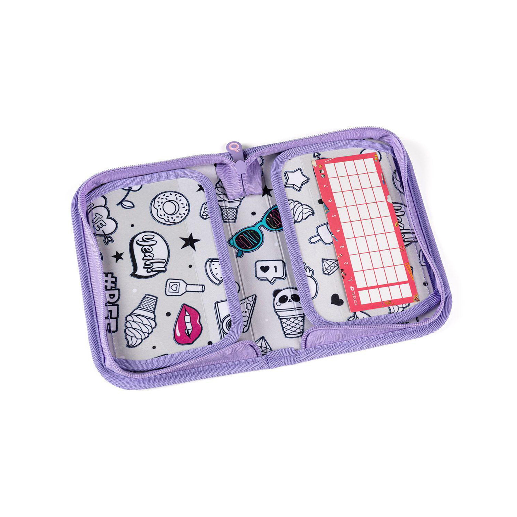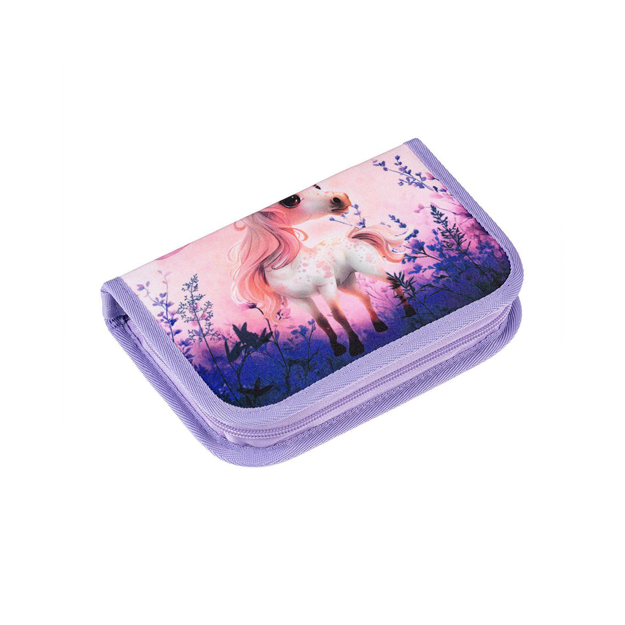 Stylový jednopatrový penál s motivem pohádkového koníka potěší všechny holčičky, které chtějí mít přehled ve svých školních potřebách a zároveň milují kreativitu. Uvnitř se totiž nachází šedá podšívka s obrázky k vybarvení. Penál má 2 klopy a gumové úchyty pro 21 pastelek, tužek či fixů plus 3 širší místa na pravítko, kružítko nebo nůžky a 2 větší úchyty na gumu a ořezávátko. Pod průhlednou folií najdete rozvrh hodin, druhá kapsa na klopě může posloužit jako úložiště na poznámky. Polstrování chrání všechny potřeby, zipy s velkými taháčky usnadňují dětem manipulaci. Penál není vhodný do pračky. Parametry produktu Hmotnost: 200 g Rozměry: 21 × 5 × 14 cm Materiál: 100% polyester