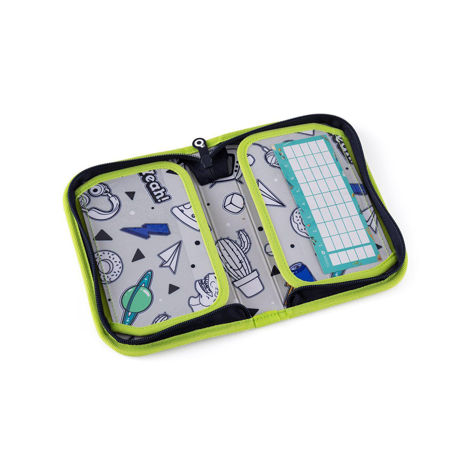 Stylový zeleno-modrý jednopatrový penál s pixelovým motivem potěší všechny kluky a milovníky Minecraftu, kteří chtějí mít přehled ve svých školních potřebách a zároveň milují kreativitu. Uvnitř se totiž nachází šedá podšívka s obrázky k vybarvení. Penál má 2 klopy a gumové úchyty pro 21 pastelek, tužek či fixů plus 3 širší místa na pravítko, kružítko nebo nůžky a 2 větší úchyty na gumu a ořezávátko. Pod průhlednou folií najdete rozvrh hodin, druhá kapsa na klopě může posloužit jako úložiště na poznámky. Polstrování chrání všechny potřeby, zipy s velkými taháčky usnadňují dětem manipulaci. Penál není vhodný do pračky. Parametry produktu Hmotnost: 200 g Rozměry: 21 × 5 × 14 cm Materiál: 100% polyester