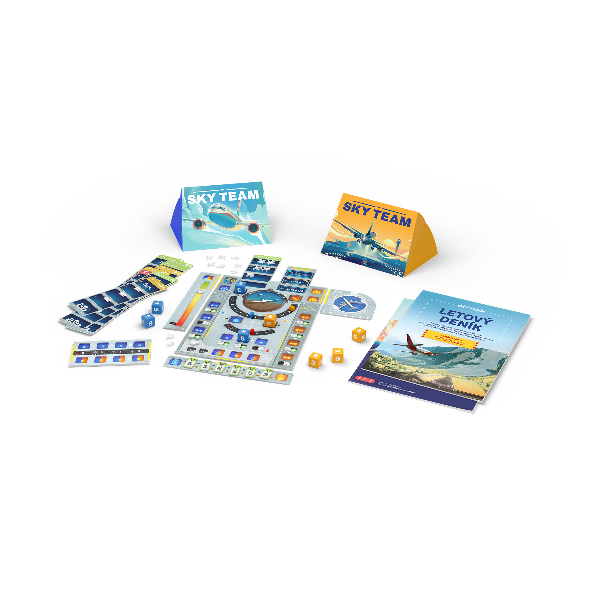 Jdeme na přistání! Staňte se dvojicí pilotů a ujměte se řízení dopravního letadla! Koordinujte své kroky a pokuste se s letadlem úspěšně přistát. Zažijte napětí, jako byste byli přímo v kokpitu. Poznejte 11 světových letišť od Montrealu po Prahu a s tím 21 vzrušujících scénářů inspirovaných skutečnými podmínkami pro přistání. Vítr, únik paliva, hustý provoz, náledí… Každé letiště přináší řadu vlastních výzev! Tah za tahem se pokuste strategicky rozmístit všechny kostky na přístrojovou desku a úspěšně přistaňte! V této kooperativní hře tvoříte tandem pilotů, jejichž úkolem je přistát s dopravním letadlem na letištích po celém světě. Jenže přistát s dopravním letadlem není tak snadné, jak se zdá! Budete muset komunikovat s řídící věží, abyste se ujistili, že se můžete přiblížit, aniž by vám překážel provoz na zemi. Upravíte svou rychlost, abyste nepřeletěli letiště a vyrovnáte náklon letadla, abyste klesali ve správné poloze. Vysunete klapky, čímž zvýšíte vztlak a umožníte bezpečné klesání. Pak vysunete podvozek, abyste bezpečně přistáli a nakonec aktivujete brzdy, čímž letadlo zpomalíte a úplně zastavíte. K úspěchu stačí jen spolupráce a pevné nervy! Hra Sky Team obsahuje: 1 příručku Hladké přistání, 1 třívrstvou přístrojovou desku, 1 ukazatel náklonu, 4 kostky pilota (modré), 4 kostky kopilota (oranžové), 2 zástěny/nápovědy, 1 ukazatel výšky, 1 ukazatel přiblížení (Montreal • YUL), 12 žetonů letadel, 2 značky aerodynamiky (modrá a oranžová), 1 značku brzd (červená), 3 žetony kávy, 2 žetony nového hodu, 10 přepínačů (klapky, podvozek a brzdy), 1 příručku Letový deník, 10 ukazatelů přiblížení, 1 modul paliva, 1 značku paliva, 1 modul stážisty, 6 žetonů stážistů, 1 žeton nového hodu, 1 panel větru, 1 modul brzdění na ledu, 6 karet speciálních schopnosti, 1 kostku provozu (černá).