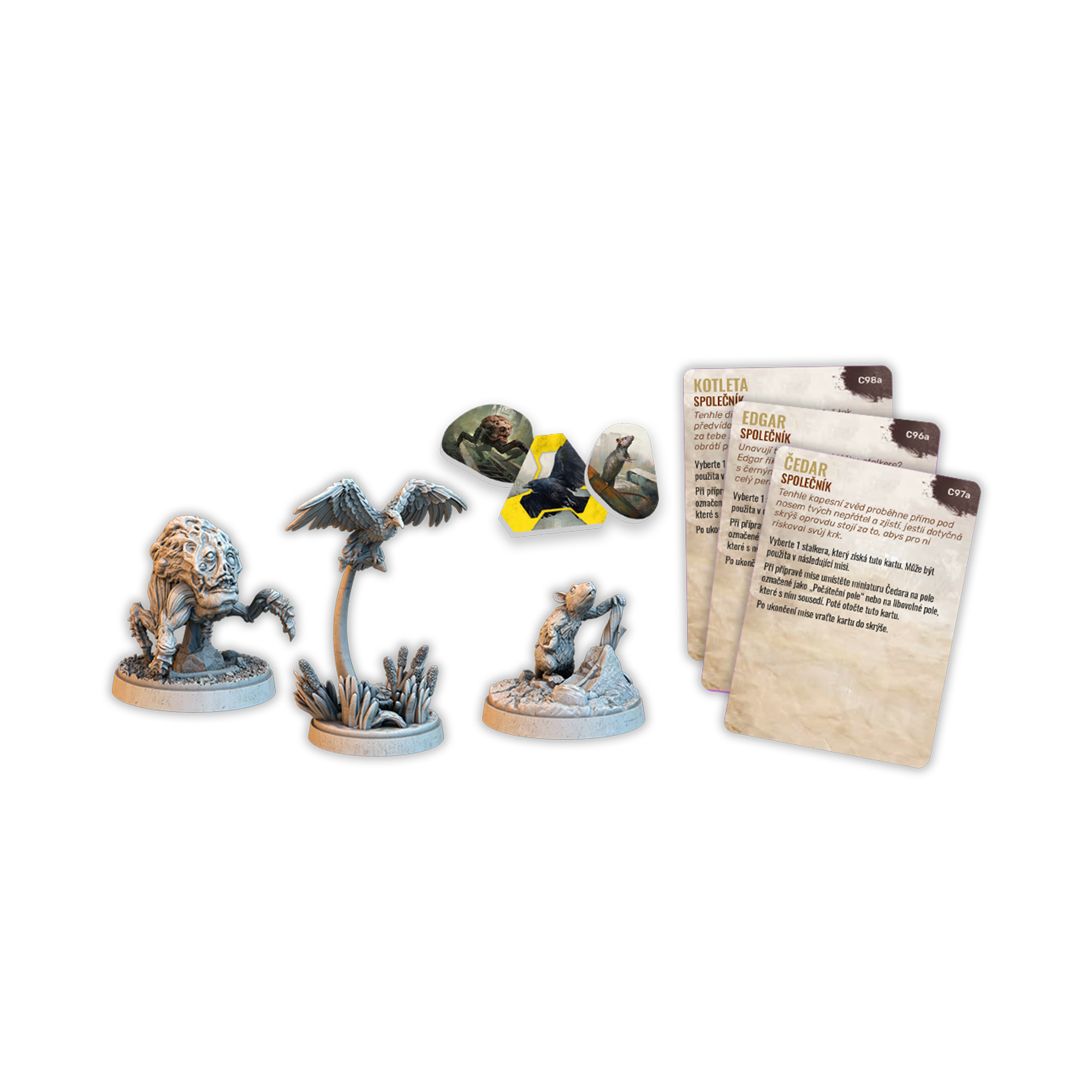 Sada nových společníků vám umožňuje obohatit své dobrodružné výpravy o nejrůznější mazlíčky. Stalker – Společníci ze Zóny přináší 3 zvířecí pomocníky. Seznamete se s vránou Edgarem, krysou Čedarem nebo zmutovaným Kotletou. Karty kontaktů z tohoto rozšíření jednoduše umístěte do své skrýše. Rozšíření není samostatně hratelné – potřebujete vlastnit základní hru Stalker: Desková hra. Komponenty jsou v českém jazyce. Hra Stalker – Společníci ze Zóny obsahuje: 3 miniatury společníků, 3 karty kontaktů (společníků), 3 žetony společníků.