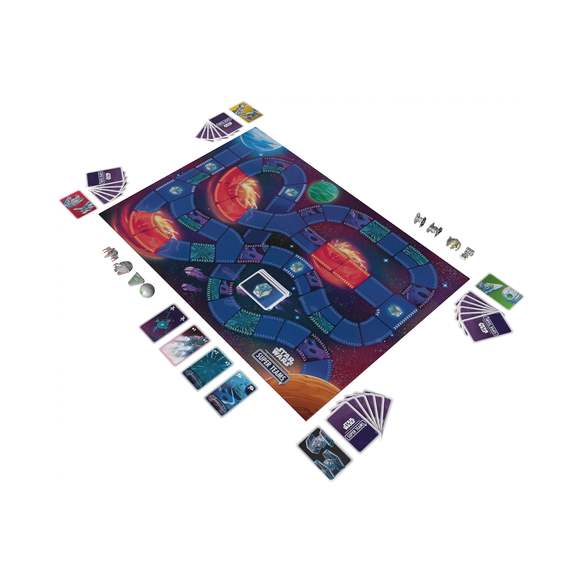 Staňte se součástí neúprosného vesmírného závodu mezi Hvězdou smrti, X-wingy nebo TIE Fightery a doražte do cíle dřív než vaši soupeři. V této svižné týmové hře rozhodují dobré karty, správné načasování i překvapivé bonusy. Hra star warssuper Teams obsahuje: 1 herní mapu, 8 figurek lodí, 72 karet, česká a slovenská pravidla.