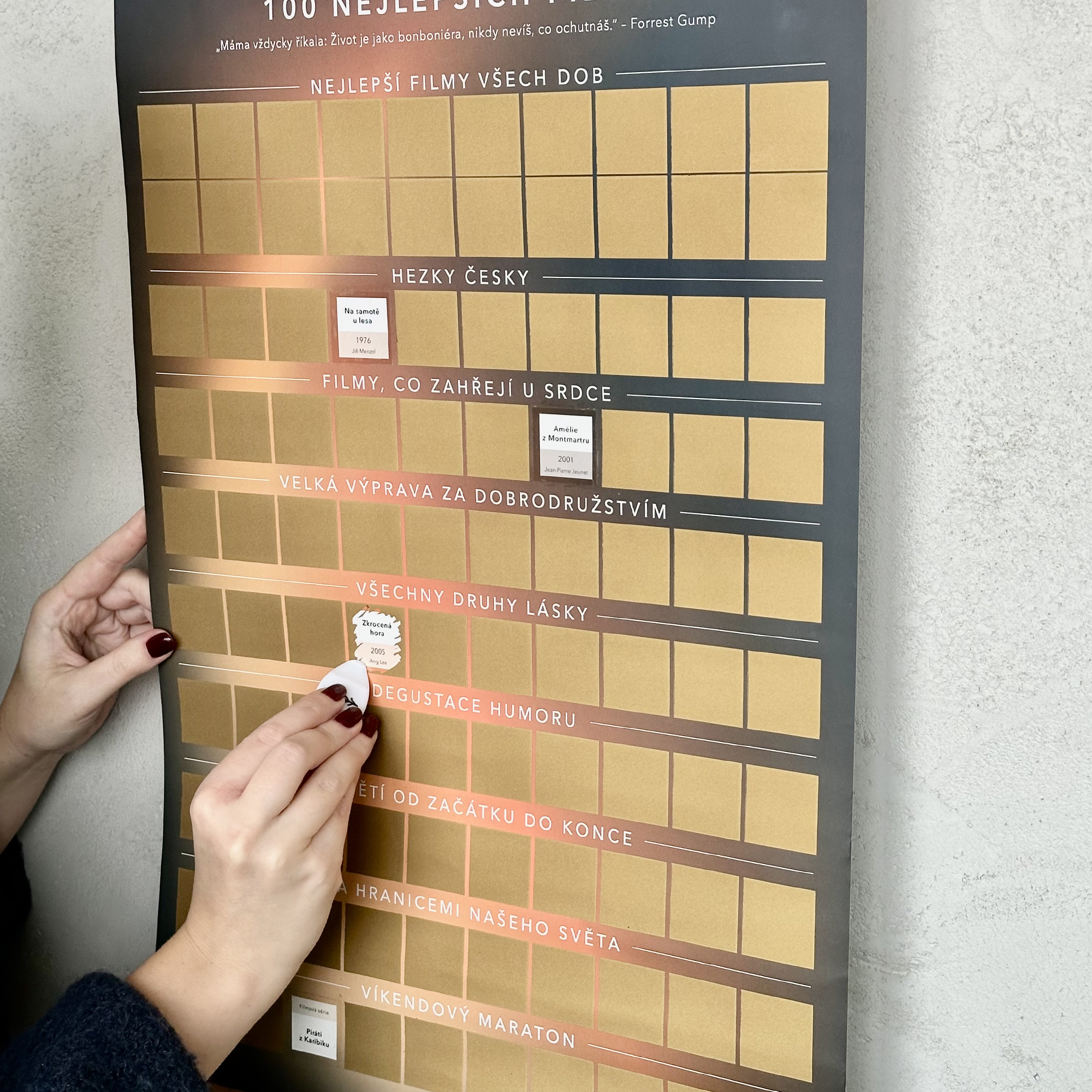 Stírací plakát: 100 tipů na nejlepší filmy je ideální pro všechny, kdo milují kinematografii a chtějí objevovat ikonické snímky české i světové filmové scény. Plakát obsahuje 100 pečlivě vybraných filmů – od nadčasových klasik až po moderní hity, které nesmí chybět na vašem filmovém seznamu. Stírací plakát je skvělým dárkem pro filmové fanoušky, přátele i rodinu. Jak to funguje? 1. Pověste Zavěste plakát na zeď pomocí přiloženého magnetického rámu – bude nejen praktickým pomocníkem, ale i stylovou dekorací. 2. Vyberte a setřete Zvolte žánr, na který máte chuť, a škrabátkem setřete náhodné políčko. Pod stírací vrstvou objevíte filmový tip, který vás čeká. 3. Užijte si filmový večer Udělejte si pohodlí, připravte popcorn a ponořte se do světa skvělých filmů. Stírací plakát – 100 tipů na nejlepší filmy obsahuje: stírací plakát, dřevěný magnetický rám (41 cm) a stylové škrabátko, které udělá ze stírání ještě větší zábavu.