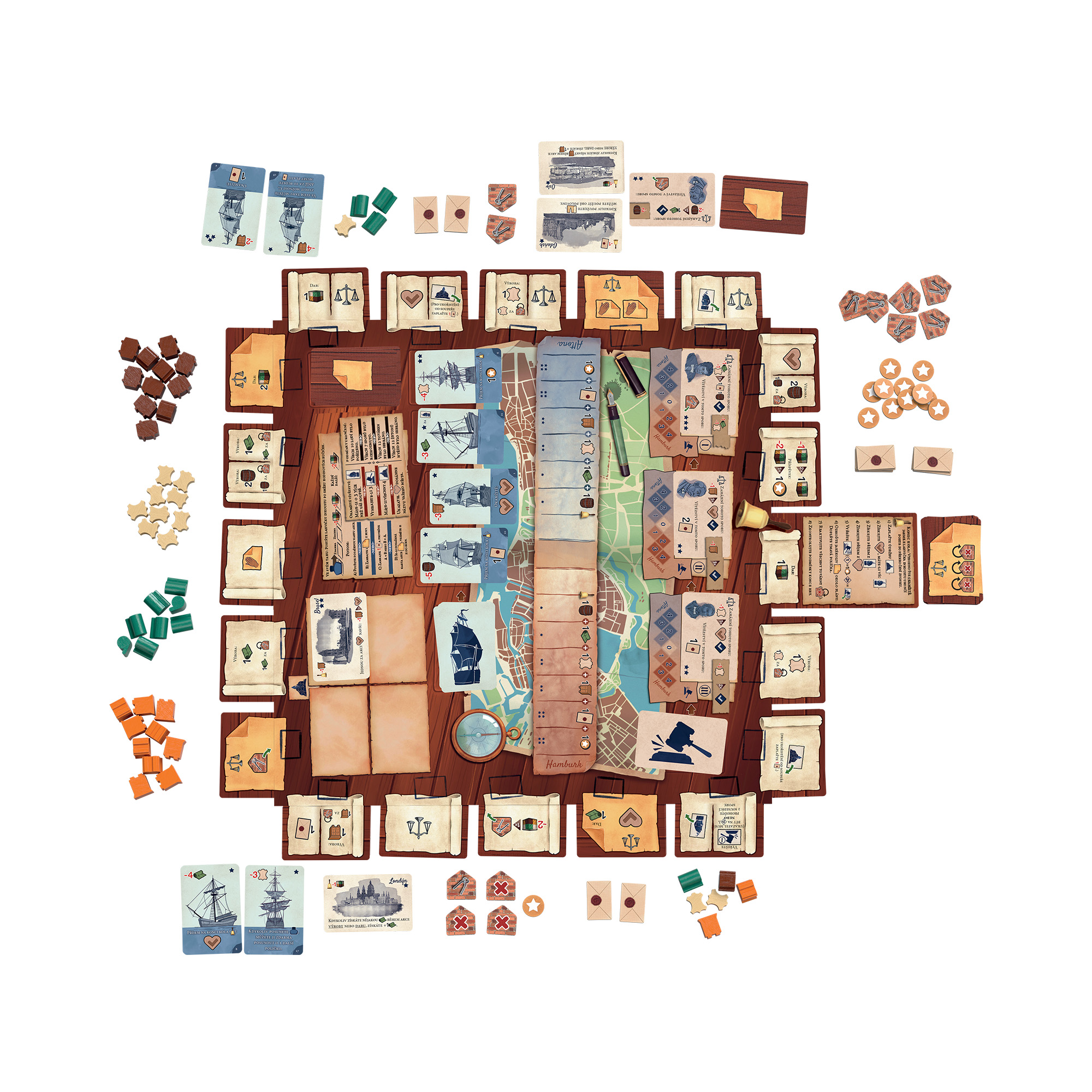 Střet měst je ideální strategická hra pro 2 hráče od 10 let, kteří mají rádi taktický souboj plný plánování a překvapivých obratů. Přeneste se do 16. století, staňte se vůdcem Hamburku nebo Altony a ovládněte obchodní trh! V této strategické hře budujete továrny, vyrábíte zboží a vysíláte lodě, abyste získali převahu v prestiži, obchodu či spojenectvích. Pokud diplomacie selže, nastupují napínavé soudní spory, kde rozhoduje vaše strategie i ochota riskovat. Odhadněte soupeře, využijte každou šanci a ovládněte město pomocí vlivu, peněz nebo chytrých intrik. Hra Střet měst obsahuje: 1 herní plán, 78 karet, 48 dřevěných žetonů produktů, 1 dřevěnou lahvičku inkoustu, 1 dřevěný ukazatel prestiže, 3 dřevěné ukazatele sporu, 12 dílků továrny, 12 žetonů hvězdy, 12 dílků dopisu, 3 dílky sporu, 2 přehledy, 1 žeton zvonku, 4 úložné boxy, česká pravidla.