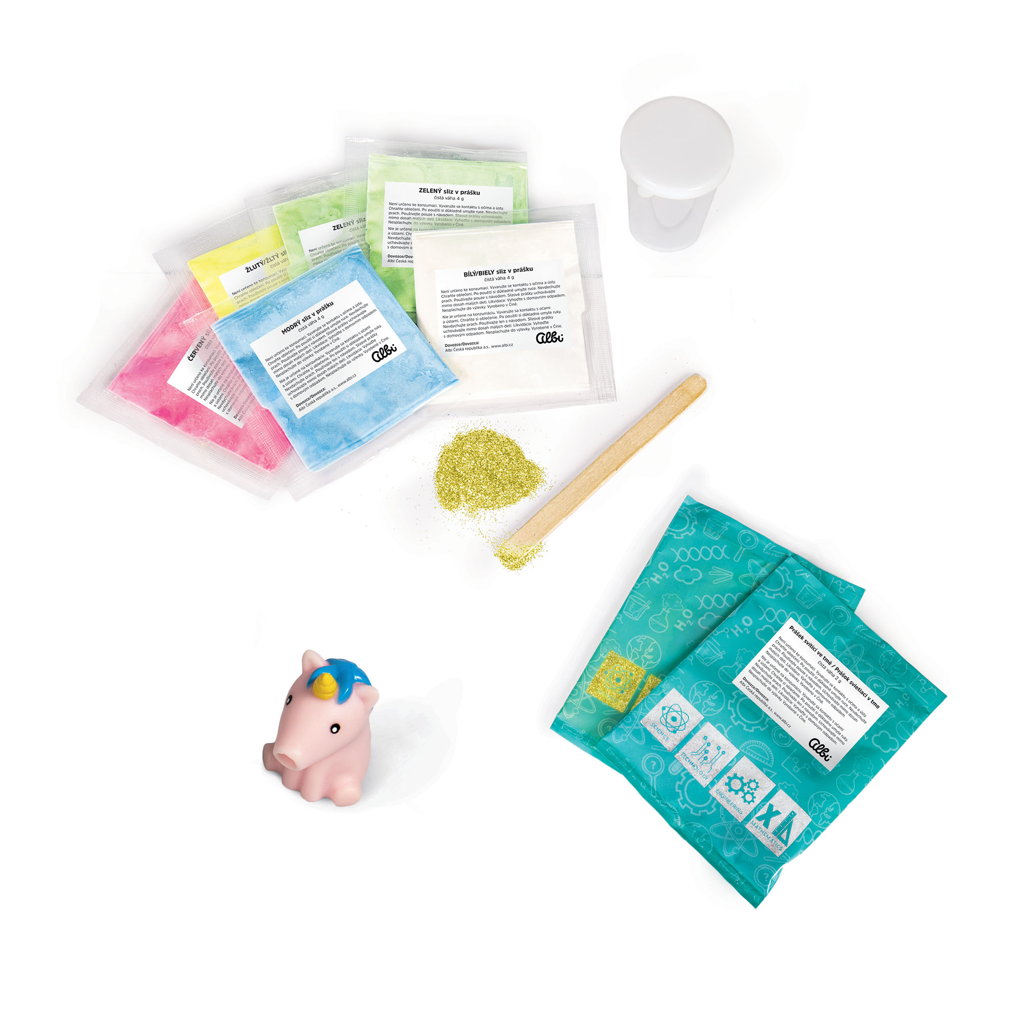 Malá vědecká sada v plechovce na vlastnoruční výrobu super slizu z edice Albi Science zabaví malé vědátory už od 8 let. Užijte si extra porci zábavy s úžasně pružným slizem, který si vyrobíte přesně podle svých představ. Bude průhledný, jednobarevný, duhový, perleťový nebo dokonce svítíci ve tmě? To vše bude záležet pouze na vás – tak nezapomeňte, že fantazii se meze nekladou, protože… Počkat! Co je to za zvuky? To je stále hladový jednorožec, kterého moc bolí břicho – pozor, už blinká – duhu! Sada je navíc v krásné plechové krabičce, do které si můžete uschovat osobní poklady. Super sliz – plechovka obsahuje: 1 sáček růžového slizu v prášku, 1 sáček modrého slizu v prášku, 1 sáček žlutého slizu v prášku, 2 sáčky zeleného slizu v prášku, 1 sáček bílého slizu v prášku, 1 sáček perleťového prásšku, 1 sáček přášku svítícího ve tmě, 1 odměrku s víčkem, 1 míchátko a 1 postavičku jednorožce.