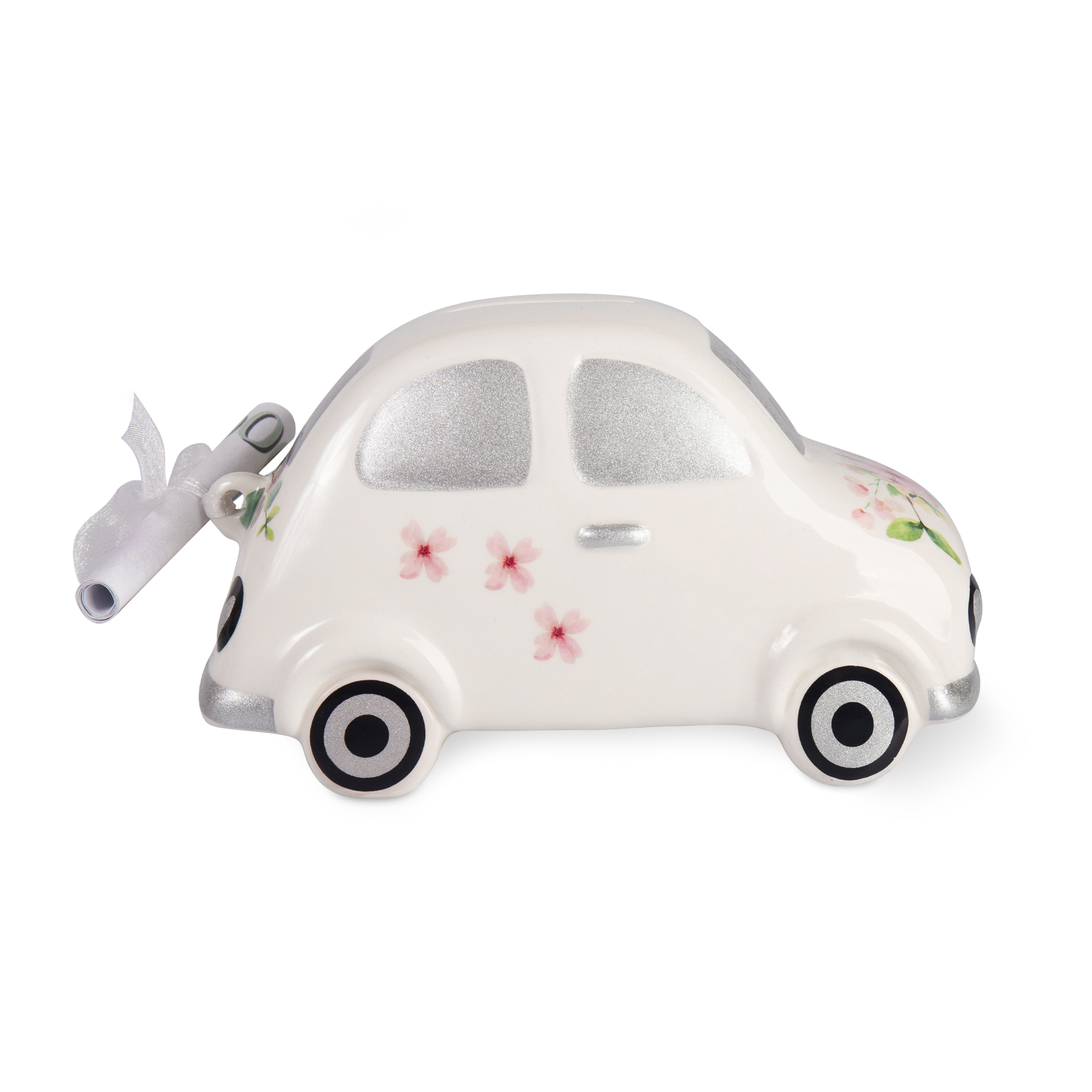 Chystáte se letos na svatbu a hledáte originální a zároveň vtipný způsob, jak novomanželům darovat peníze? A líbí se vám nápad přispět jim na jejich svatební cestu? Tato keramická pokladnička bude tou správnou volbou: peníze můžete vložit dovnitř autíčka nebo roličku bankovky přivázat dozadu nad SPZ Novomanželé. Autíčko má na spodní straně otvor pro pozdější vyndání nastřádaných peněz. Rozměry: 9 cm × 8,5 cm ×15 cm Materiál: keramika