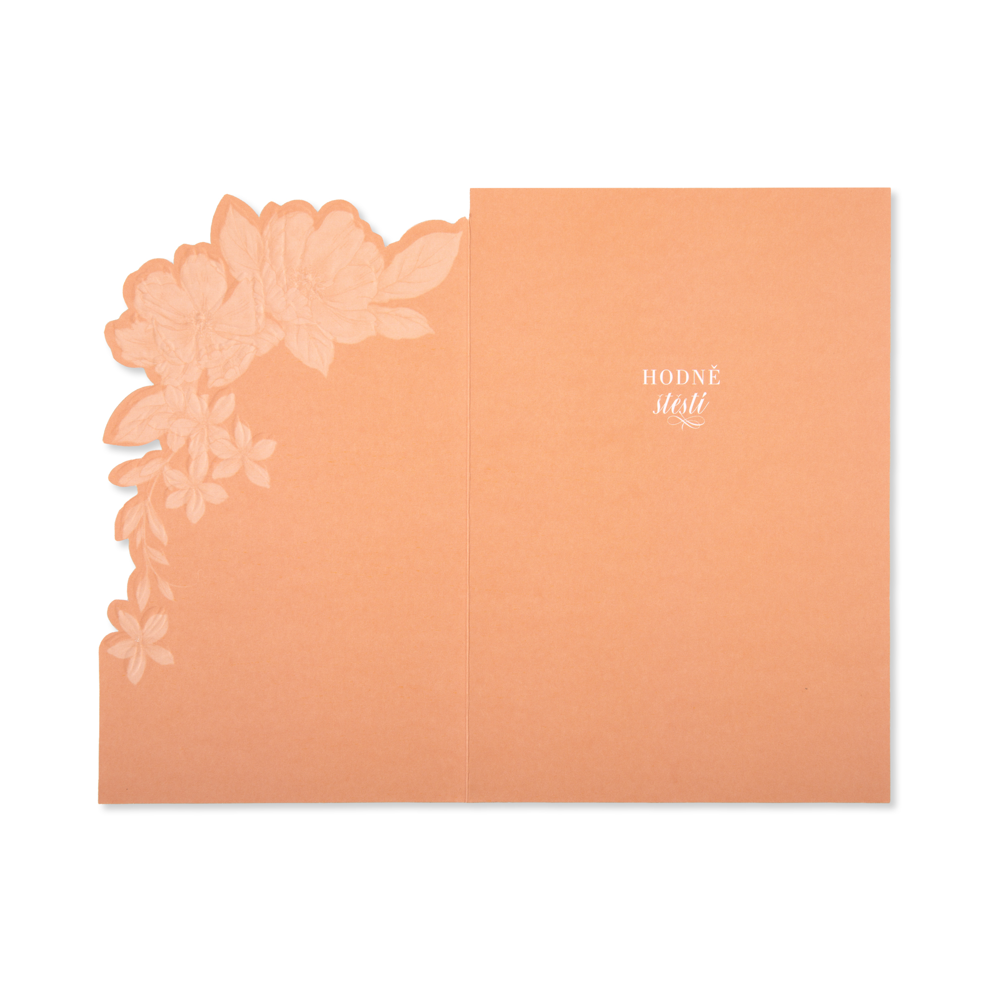Darujte novomanželům papírové přáníčko a podtrhněte kouzlo svatebního dne. přání s výsekem a reliéfní ražbou (slepotiskem) květů zdobí růžová ražba. Uvnitř najdete stručné věnování a zároveň dostatek místa pro Váš podpis či vzkaz. Text přání: Novomanželům. Sdílet lásku, sdílet smích, sdílet štěstí, spolu snít. Hodně štěstí Součástí je i bílá obálka, ve které můžete přání darovat. Rozměry přání: 13,5 × 19,5 cm
