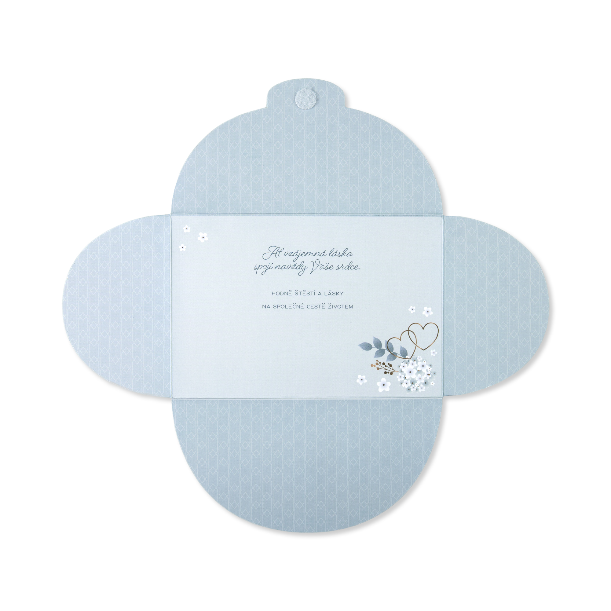 Darujte novomanželům papírové přáníčko a podtrhněte kouzlo svatebního dne. Světle modré přání ve tvaru obálky s motivem pomněnek a srdíček zdobí zlatá ražba. Přání má originální otevírání na suchý zip a po jeho rozevření uvnitř najdete milé věnování a zároveň dostatek místa pro Váš podpis či vzkaz. Text přání: Ať vzájemná láska spojí navždy Vaše srdce. Hodně štěstí a lásky na společné cestě životem Rozměry složeného přání: 11,5 × 16,8 cm