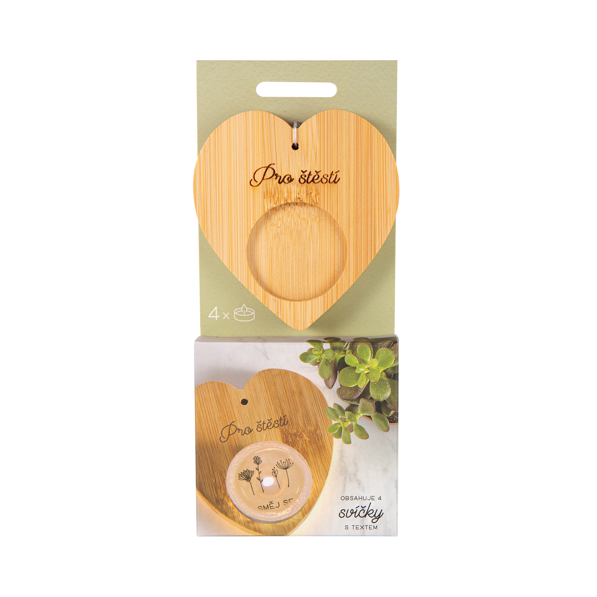 Dárkové balení svícnu s věnováním a 4 svíček s milým textem, který se magicky objeví až po rozehřátí vosku. Umístěte svíčku do bambusového svícnu s věnováním a vychutnejte si moment, kdy se ve světle plápolajícího plamene odhalí tajemství skryté pod vrstvou rozehřátého vosku. Balení obsahuje bambusový svícen a 4 čajové svíčky s různými vzkazy. Svíčky s překvapením jsou vhodné jako dárek pro maminku, babičku nebo pro paní učitelku. Můžete je věnovat k narozeninám, k Vánocům nebo jen tak pro štěstí.