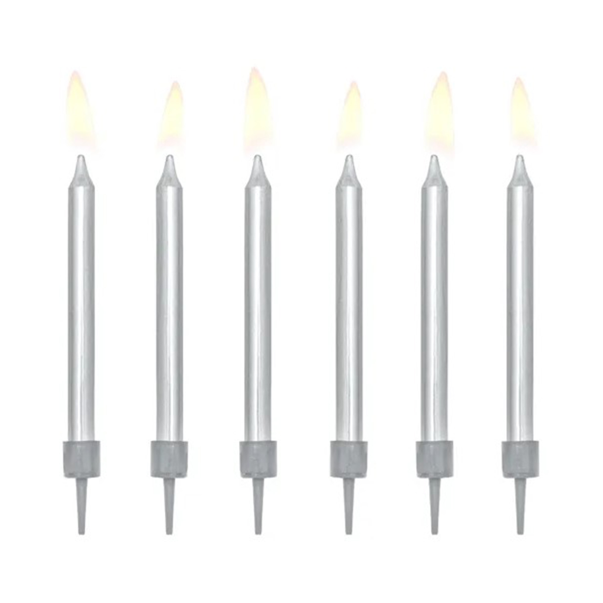 Sada dortových svíček ve stříbrné barvě je ideální pro elegantní ozdobu narozeninového dortu.  Tato sada obsahuje 6 kusů svíček a můžete ji kombinovat s dalšími párty doplňky a dekoracemi v podobných barvách. Pro další stříbrné párty doplňky můžete prozkoumat naši sekci Stříbrná. Postup: Svíčku zapíchneme do dortu nebo do jiného měkkého podloží, před zapálením zkontrolujeme zda směřuje vzhůru. Upozornění: Doporučujeme produkt zapalovat ve volném, nejlépe venkovním prostoru a v dostatečné vzdálenosti od stojících osob. Neumísťujeme k hořícím svíčkám ani k jiným hořlavým předmětům! Jako u všech hořlavin je třeba důsledně dbát na bezpečnost a přistupovat k ní jako k hořlavině. Výška svíčky: 6 cm Obsah balení: 6 ks stříbrných svíček