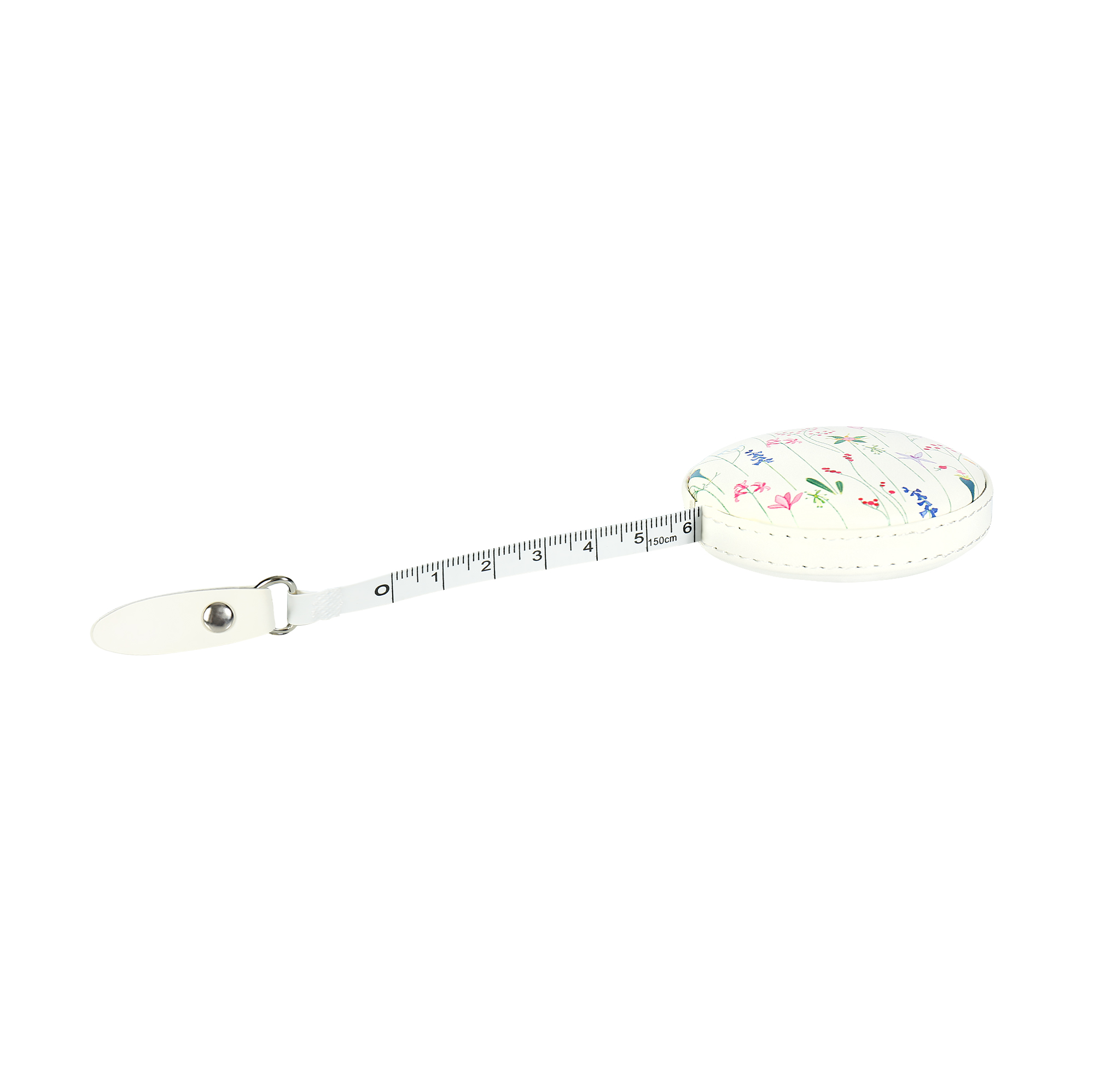 Svinovací metr v koženkovém obalu s něžným květinovým designem je vychytávkou do každé kabelky, která usnadní měření všem ženám. Metr se lehce vysune vytažením a stisknutím obou stran pouzdra se zase sám automaciky zasune. Průměr: 5,5 cm Délka: 150 cm
