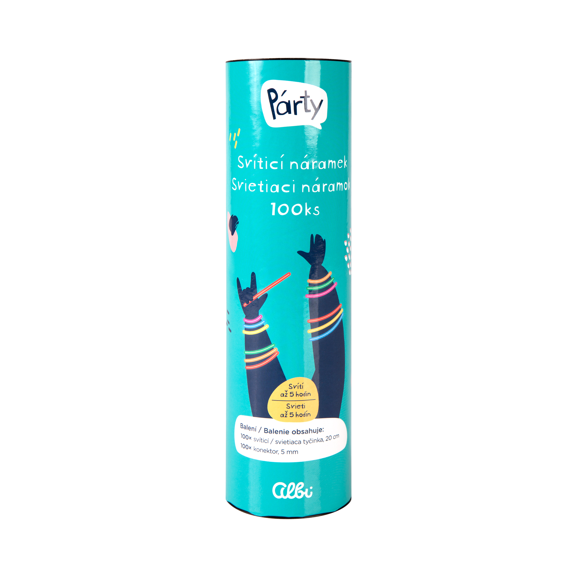 Sada 100 kusů svítících náramků v mixu barev, se kterou rozzáříte každou párty! Má všestranné využití – letní párty, festivaly, tábory, firemní večírky i Halloween. Svítící tyčinky vydrží svítit až 5 hodin! Celou kolekci svítících sad můžete prozkoumat v kategorii Svítící tyčinky. Balení obsahuje: 100× svítící tyčinka (20 cm) a 100× konektor (5 mm) Použití: Tyčinku ohýbejte, lámejte a třeste s ní. Může trvat několik okamžiků, než dosáhne plného jasu. Upozornění: Uchovávejte svítící tyčinku v původním obalu, dokud nebude připravena k použití. Vnitřní tyčinka obsahuje sklo. Neprořezávejte ani nepropichujte povrch svítící tyčinky. Chemické látky ve výrobku jsou nehořlavé, ale mohou trvale znečistit nábytek, oblečení a koberce. Po použití svítící tyčinku zlikvidujte v souladu se zákonem o odpadech. Nenechávejte svítící tyčinky na přímém slunci ani je nevystavujte vysokým teplotám. Při zasažení kůže nebo očí důkladně vypláchněte vodou. Složky nezpůsobí poranění očí, ale mohou způsobit dočasné potíže. Nepijte tekutinu ani ji nevkládejte do úst! Vhodné pro děti od 5 let. Doporučuje se dohled dospělé osoby.