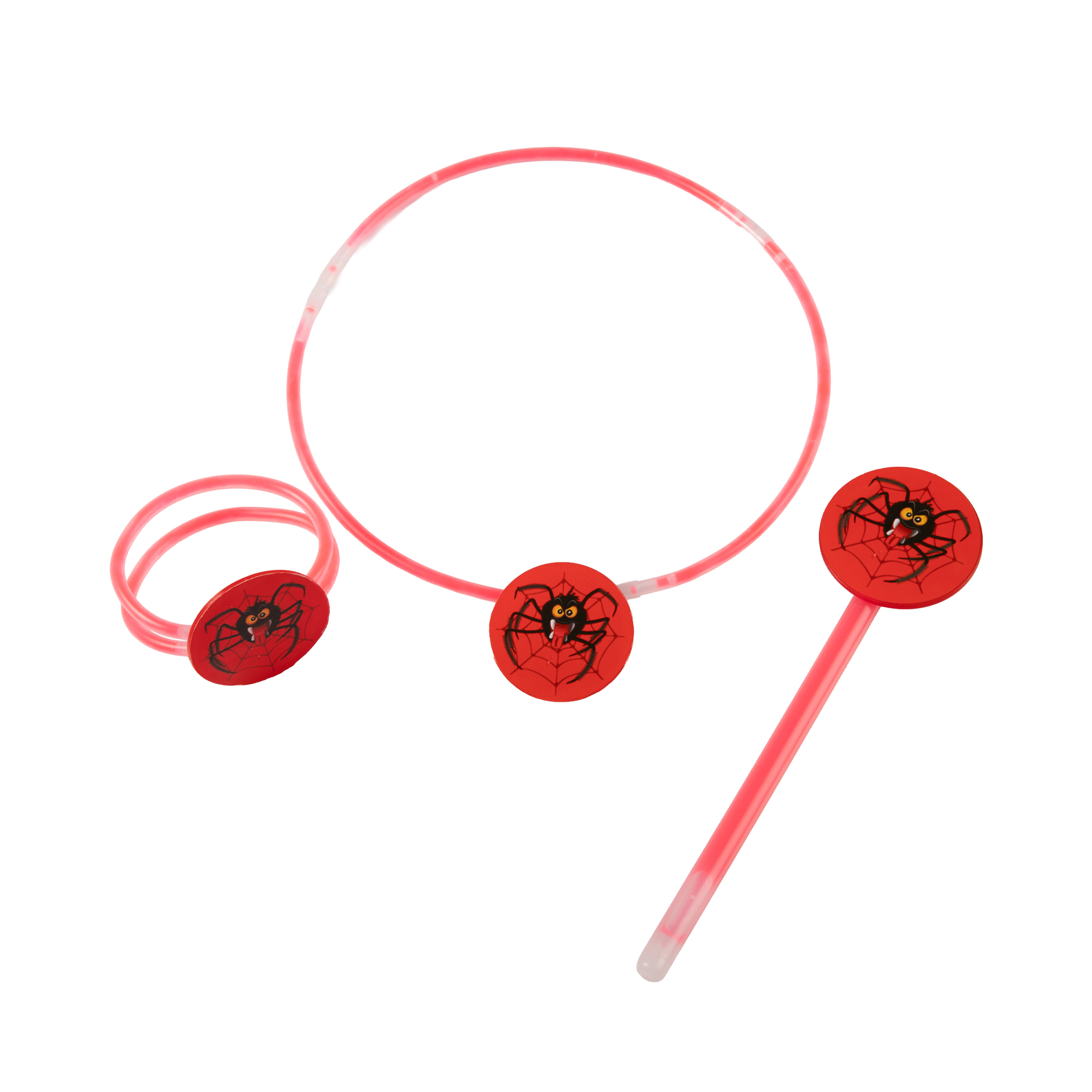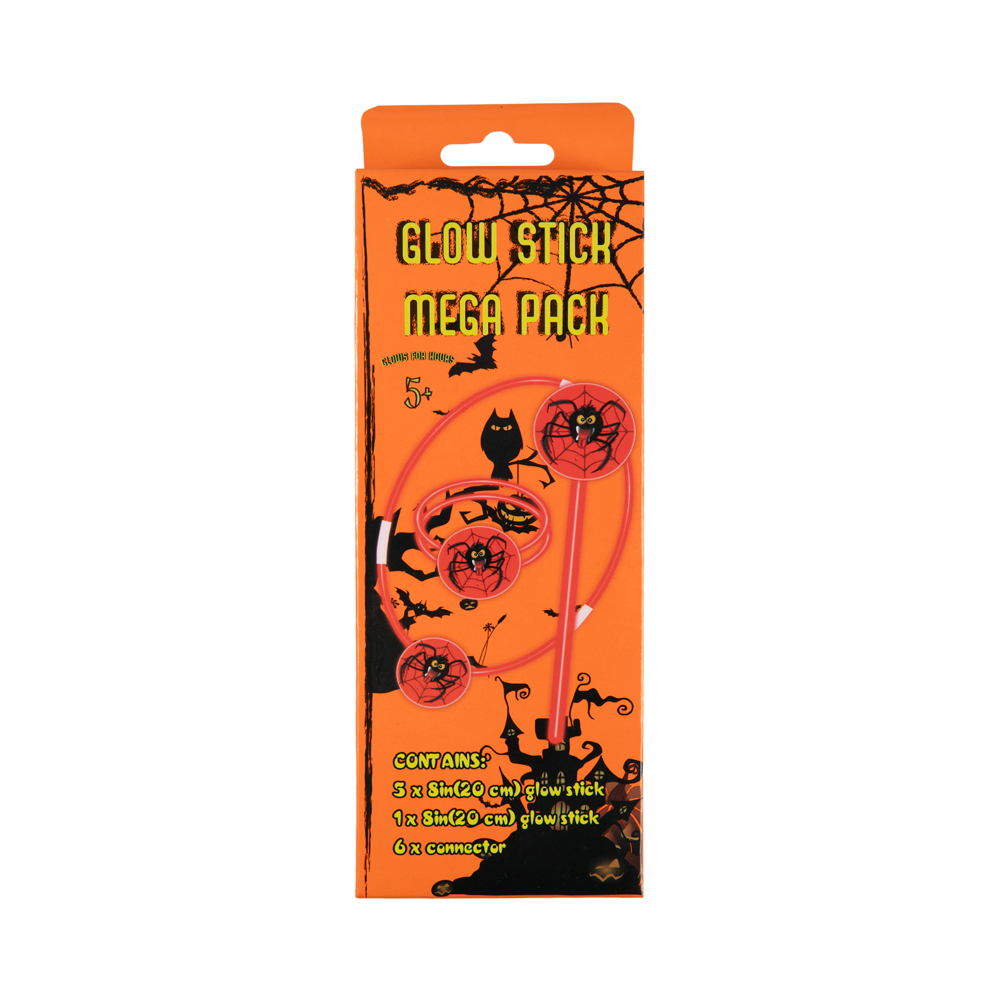 Svítící pavoučí sada, se kterou rozzáříte každou párty! Ze sady vyrobíte svítící náhrdelník, hůlku a náramek ozdobené obrázky děsivých pavouků. Balení obsahuje tyčinky, které po aktivaci svítí ve tmě. Tato sada je vhodná pro večerní aktivity a skvěle doplní kostým na Halloween, strašidelnou párty nebo Pálení čarodějnic. Svítící tyčinky vydrží svítit až 5 hodin! Balení obsahuje: 3 × svítící tyčinka (5 cm), 5 × svítící tyčinka (15 cm), 9 × svítící tyčinka (20 cm), 1 × provázek a 17 × konektor Použití: Tyčinku ohýbejte, lámejte a třeste s ní. Může trvat několik okamžiků, než dosáhne plného jasu. Upozornění: Uchovávejte svítící tyčinku v původním obalu, dokud nebude připravena k použití. Vnitřní tyčinka obsahuje sklo. Neprořezávejte ani nepropichujte povrch svítící tyčinky. Chemické látky ve výrobku jsou nehořlavé, ale mohou trvale znečistit nábytek, oblečení a koberce. Po použití svítící tyčinku zlikvidujte v souladu se zákonem o odpadech. Nenechávejte svítící tyčinky na přímém slunci ani je nevystavujte vysokým teplotám. Při zasažení kůže nebo očí důkladně vypláchněte vodou. Složky nezpůsobí poranění očí, ale mohou způsobit dočasné potíže. Nepijte tekutinu ani ji nevkládejte do úst! Vhodné pro děti od 5 let. Doporučuje se dohled dospělé osoby.