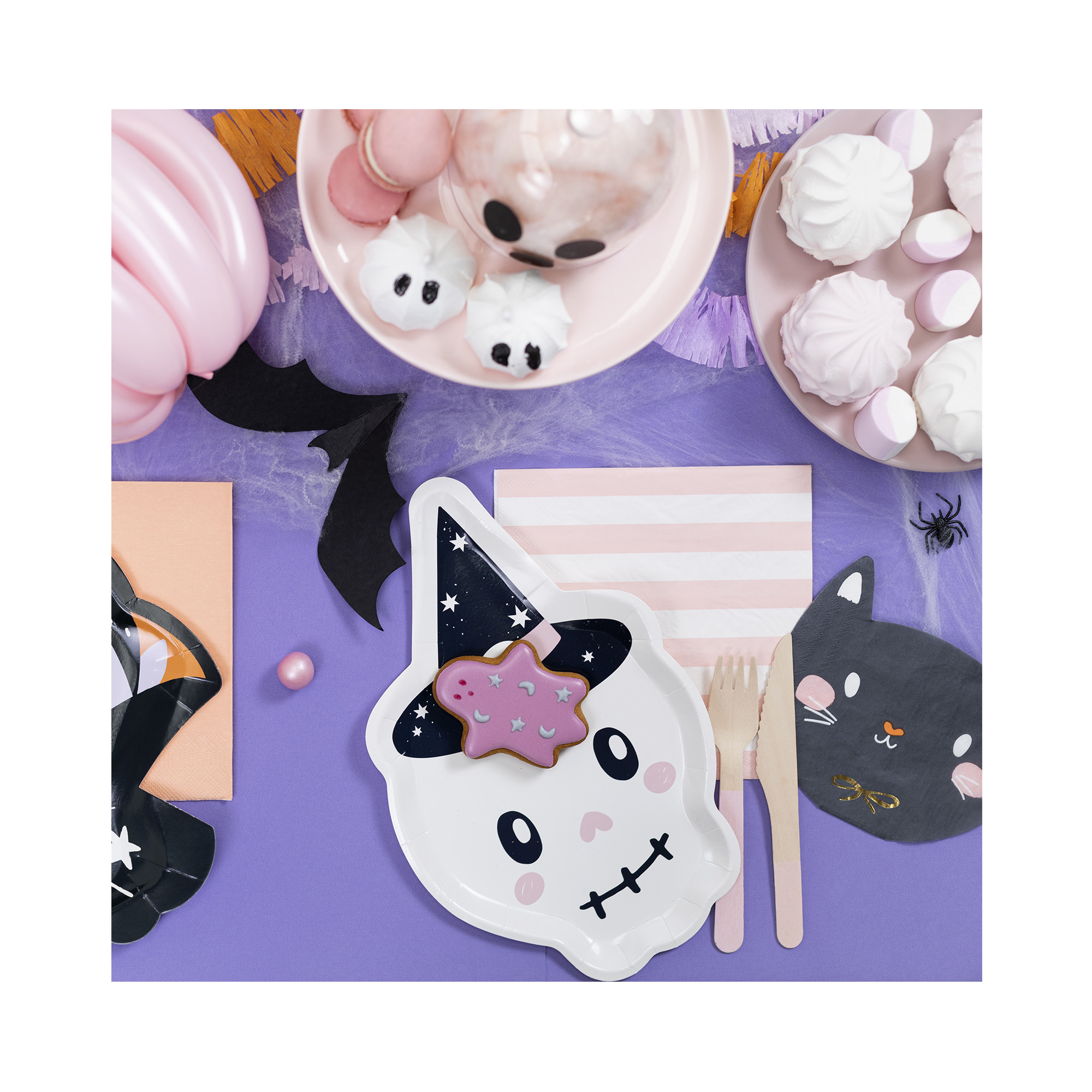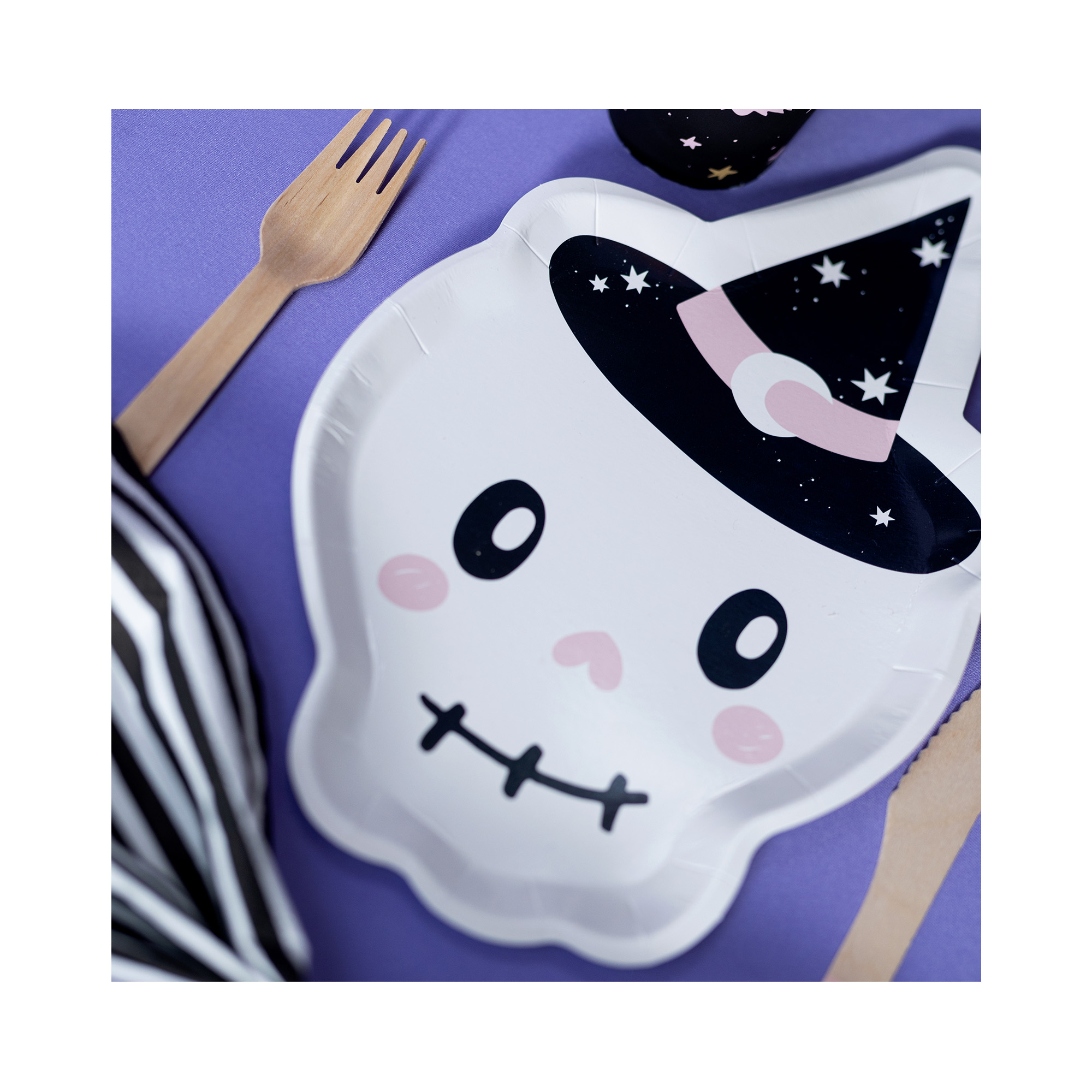 Sada šesti papírových talířů ve tvaru lebky se špičatým kloboukem je skvělou volbou, jak stolování na tematické oslavě vyřešit stylově a prakticky. Talíře jsou v bílé, černé a růžové barvě a využijete je při oslavě pálení čarodějnic nebo o Halloweenu. Pro další dekorace a kostýmové doplňky ve strašidelném motivu můžete prozkoumat naše kategorie Pálení čarodějnic nebo Halloween. Rozměry: 18 × 27 cm Balení obsahuje: 6 ks papírových talířů