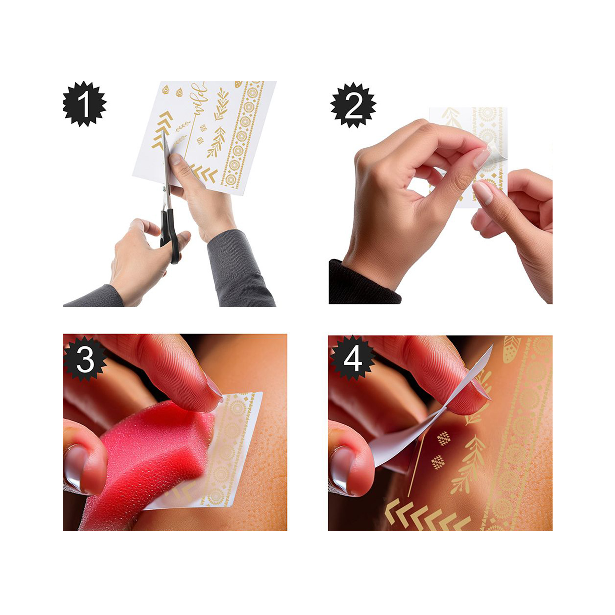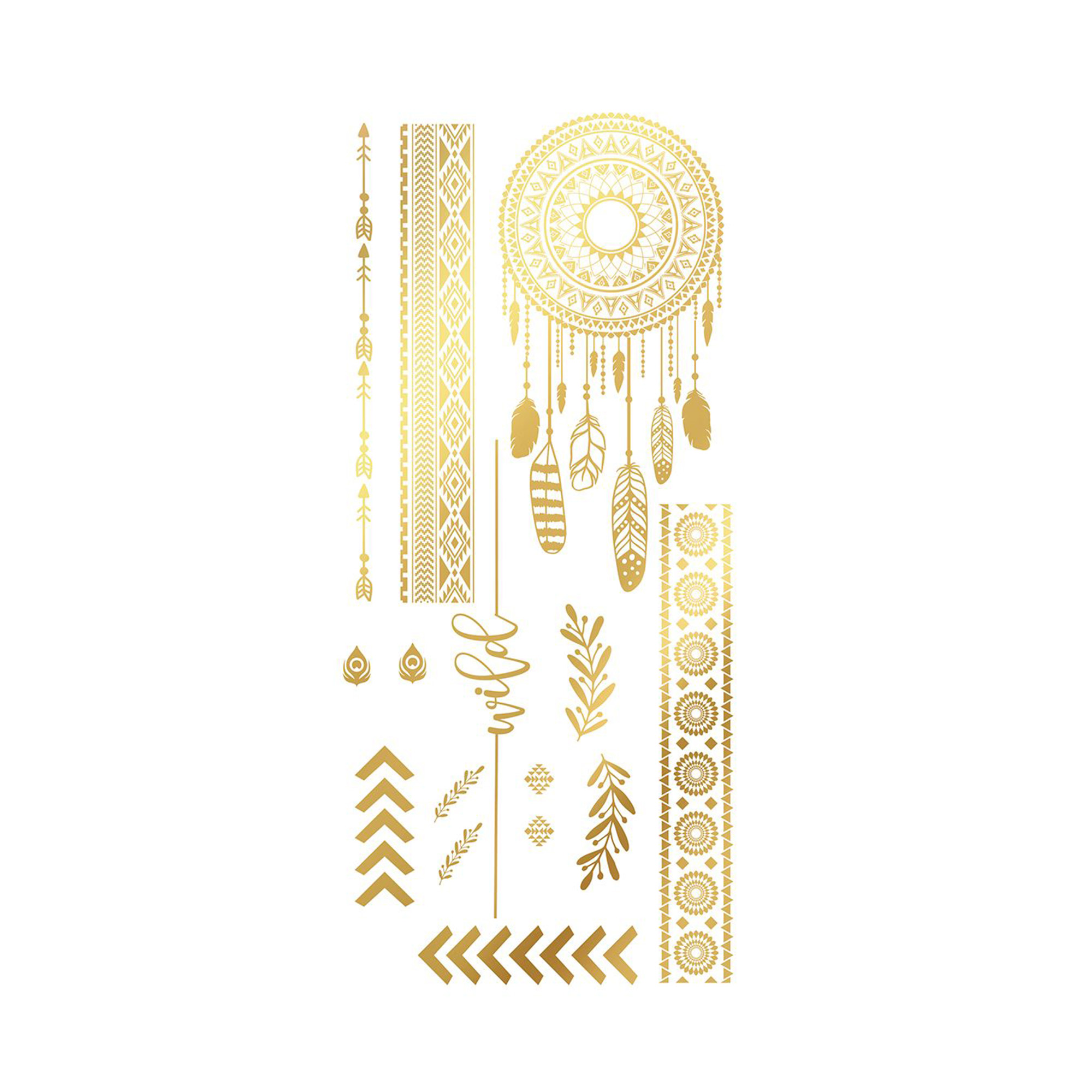 set dočasného tetování ve stylu hippie. Všechna tetování v setu mají zlatou barvu a budou originálním doplňkem vašeho festivalového outfitu nebo kostýmu na tematickou hippie párty. Balení obsahuje: 15 ks tetování