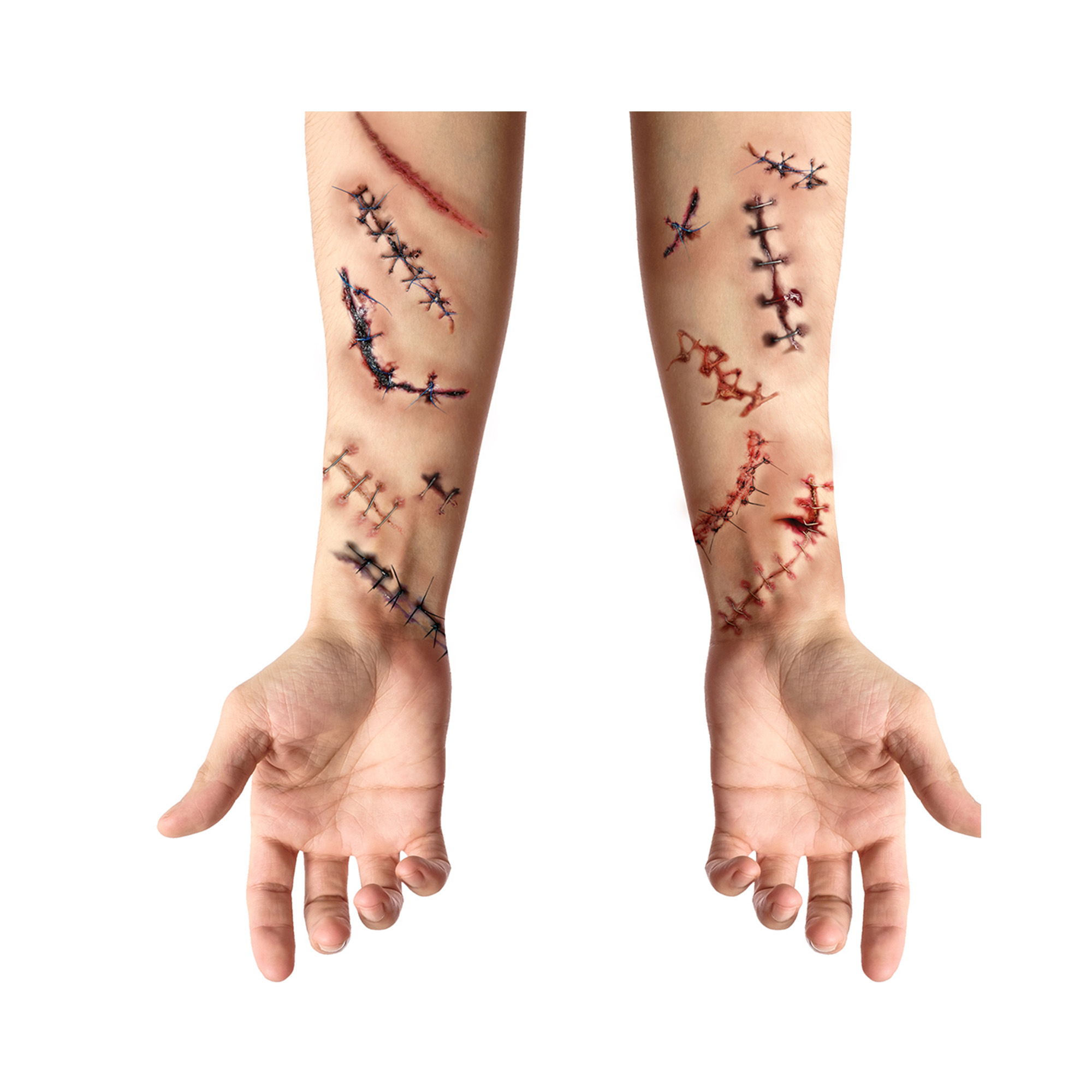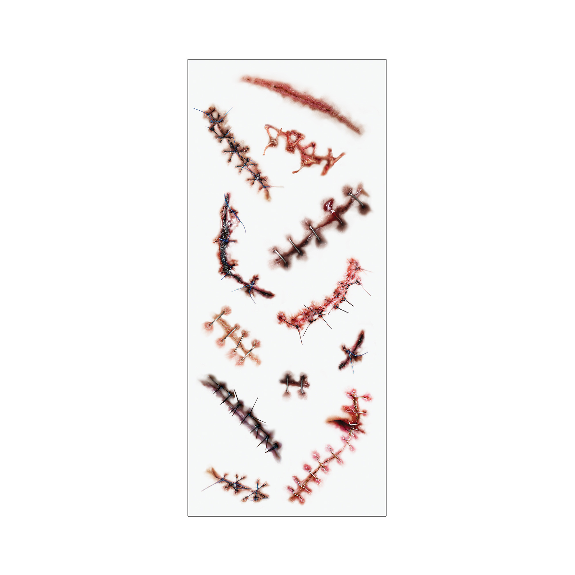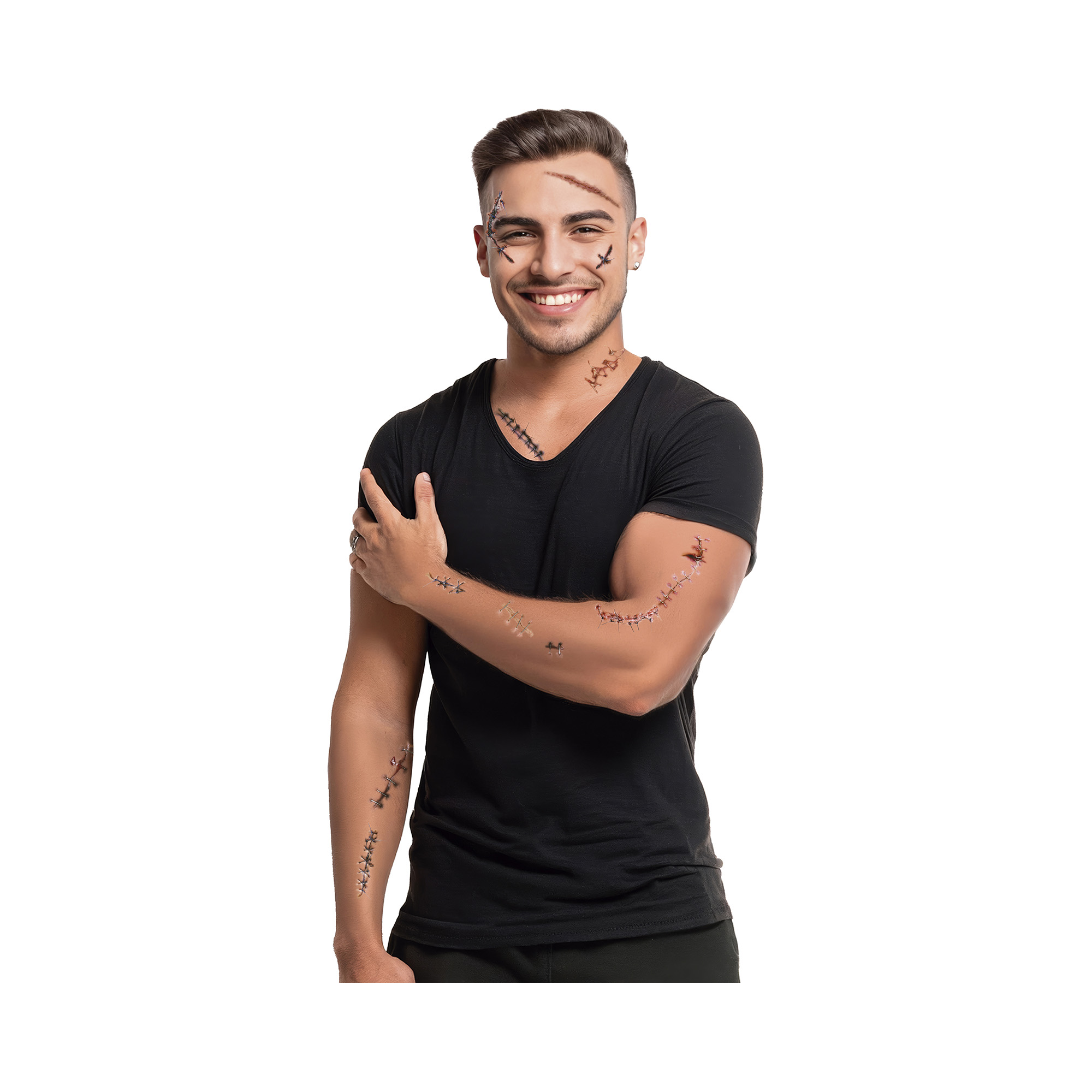 Sada dočasných tetování s motivem různých druhů jizev je nepostradatelným doplňkem kostýmu každého zombíka nebo hororové postavy. Realistické tetování s vyobrazením různě šitých a krvavých jizev – ideální volba pro Halloween nebo hororovou párty! Pro další párty doplňky a dekorace s děsivým motivem zamiřte do naší tematické kategorie Halloween. Balení obsahuje: 12 ks vzorů tetování