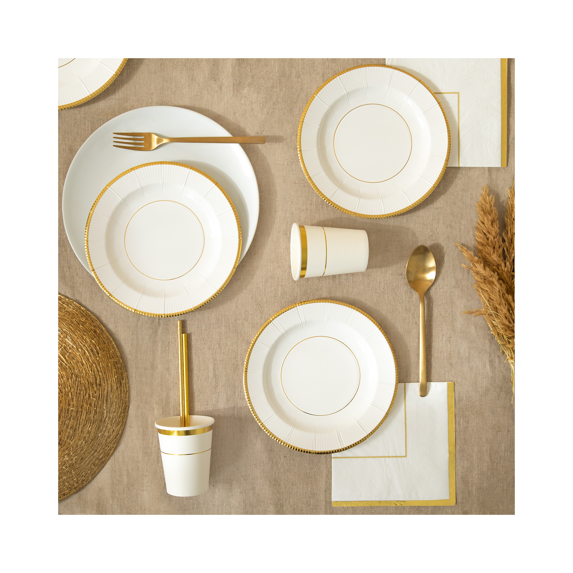 Ubrousky v bílé barvě ozdobené zlatými proužky budou elegantním doplňkem slavnostní tabule na svatbě nebo jiné významné události. Pro další svatební doplňky a dekorace můžete navštívit naši sekci Svatba a rozlučka. Rozměr ubrousků: 33 × 33 cm Balení obsahuje: 10 ks papírových ubrousků