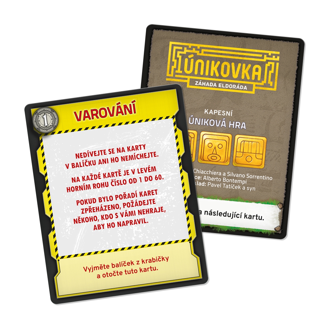 Po letech pátrání po mytickém Eldorádu se domů vracíte s prázdnýma rukama. Znenadání prorazí trup letadla obří kamenná krokodýlí hlava a vy se musíte zachránit skokem z letadla. Jste sami, unavení a hladoví ztraceni v srdci pralesa a máte k dispozici jen pár věcí, které jste stačili ve spěchu pobrat. Tohle může být váš konec… a nebo poslední šance odhalit záhadu Eldoráda. Únikovka je karetní variací na populární únikové hry, při nichž se skupina přátel nebo kolegů (lze hrát i v jednom hráči) nechá zamknout do místnosti plné rébusů a snaží se z ní v časovém limitu uniknout pryč. I karetní hra Únikovka je plná rébusů, které musíte vyřešit chcete-li uspět. A uspějete nebo selžete všichni – Únikovka je totiž kooperativní hra, tudíž hrají všichni hráči spolu a ne proti sobě. Hráči společně procházejí balíčkem karet, čímž se jim odhalují nová pravidla a nové rébusy. Některé karty představují hlavolamy, jiné nápovědy a další předměty, které se budou později hodit. Zvládnete vyřešit unikátní rébusy a uniknout z místnosti včas? Upozornění: Hry Únikovky můžete hrát plnohodnotně pouze jednou (při opakovaném hraní už budete znát řešení rébusů). Darujte ji po odehrání přátelům a porovnejte si své výsledky. Hra Únikovka – Záhada Eldoráda obsahuje: 60 velkých karet.