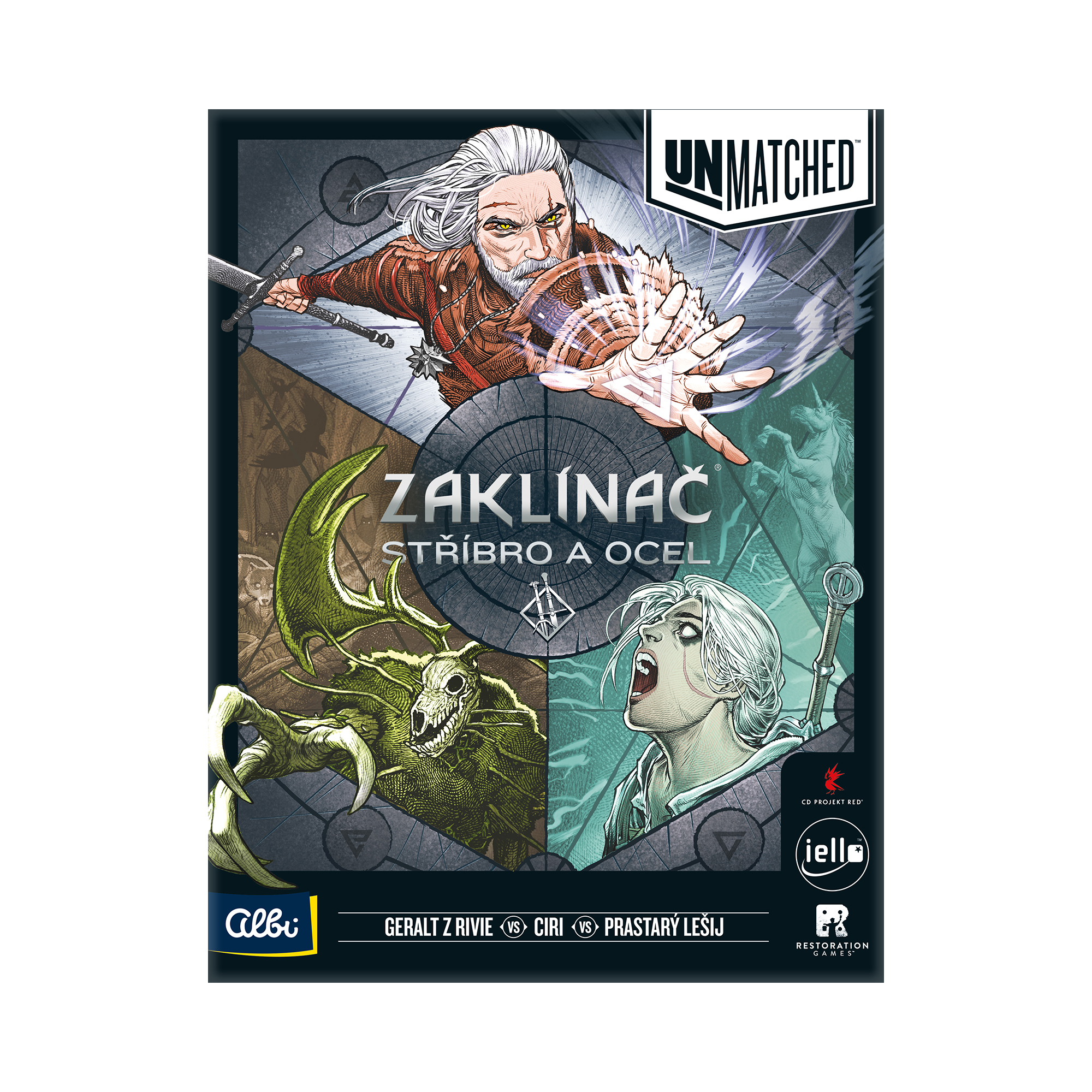 Unmatched je svižná karetní hra o soubojích nečekaných protivníků. Vyberte si svého oblíbeného hrdinu, zvolte, kde se chcete utkat, a využijte unikátní balíček a schopnosti svého favorita, abyste porazili svého protivníka. Stříbro a ocel obsahuje postavu Geralta, který je jedním z nejváženějších zaklínačů a jehož skutky byly zvěčněny pomocí pera mistra Marigolda. Dále pak Ciri – dítě Starší krve a Paní světů, které na její cestě za ovládnutím vlastních schopností pomáhá jednorožec Ihuarraquax. Třetí postavou je pak Prastarý Lešij – pravěký ochránce lesa a jeho obyvatel. Hrdiny a bojiště z jednotlivých sad systému Unmatched můžete libovolně kombinovat. Postavte se novým výzvám a objevte nové vzrušující kombinace! Unmatched Zaklínač – Stříbro a ocel obsahuje: 3 figurky, 4 žetony pomocníků, 5 ukazatelů zdraví, 99 karet, 1 oboustranný herní plán, pravidla v češtině.
