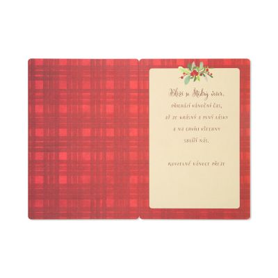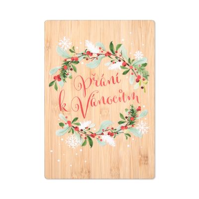 vánoční přání s bambusovými deskami. klasický nápis Přání k Vánocům lemuje jemný vánoční věnec plný bobulí, peříček a sněhových vloček. Vnitřní strana přání ukrývá krátkou báseň v rámečku, která je umístěna na červeném károvaném podkladu. Pod básní je prostor pro vaše vlastní věnování či podpis. Text uvnitř přání: Blíží se Štědrý večer, přichází vánoční čas, ať je krásný a plný lásky a na chvíli všechny sblíží nás. Kouzelné Vánoce přeje…