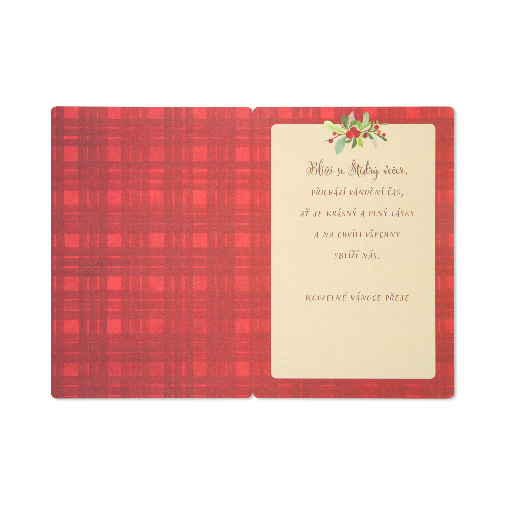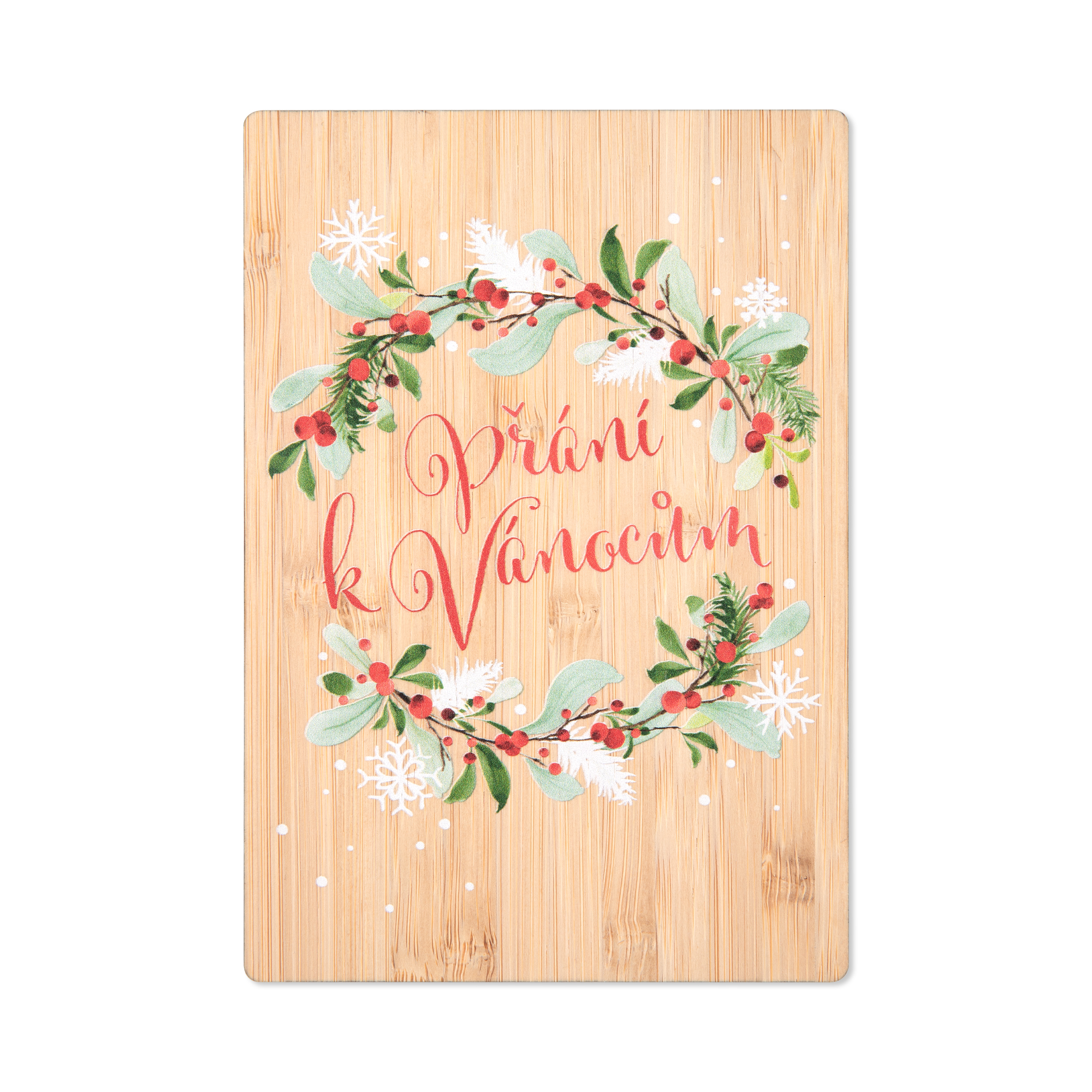 Vánoční přání s tvrdými bambusovými deskami. Klasický nápis Přání k Vánocům lemuje jemný vánoční věnec plný bobulí, peříček a sněhových vloček. Vnitřní strana přání ukrývá krátkou báseň v rámečku, která je umístěna na červeném károvaném podkladu. Pod básní je prostor pro vaše vlastní věnování či podpis. Text uvnitř přání: Blíží se Štědrý večer, přichází vánoční čas, ať je krásný a plný lásky a na chvíli všechny sblíží nás. Kouzelné Vánoce přeje… Rozměry: 10,6 x 15,5 cm
