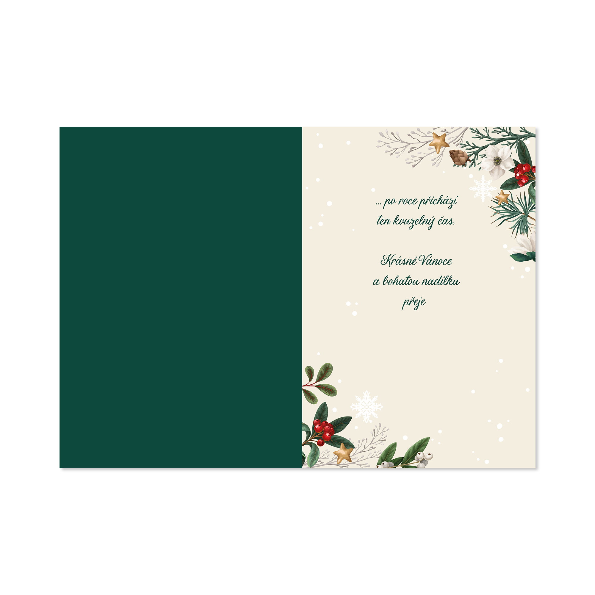 Vánoční hrací přání s motivem bílých květin, větviček, bobulí a zvonečku. Na přední straně se v oválném rámečku vyjímá část rýmovaného textu. Uvnitř se pak skrývá zbytek textu a spousta prostoru pro vaše podpisy, či vlastní věnování.  Po otevření přání začne hrát část písně od skupiny Kryštof a Karla Gotta – Vánoční. Text přání: Vánoční přání Vločky se pomalu snášejí z nebe, mráz do tváří štípe, na rukou zebe, světélka rozzáří svět okolo nás,… … po roce přichází ten kouzelný čas. Krásné Vánoce a bohatou nadílku přeje… Rozměry: 14,8 × 21 cm