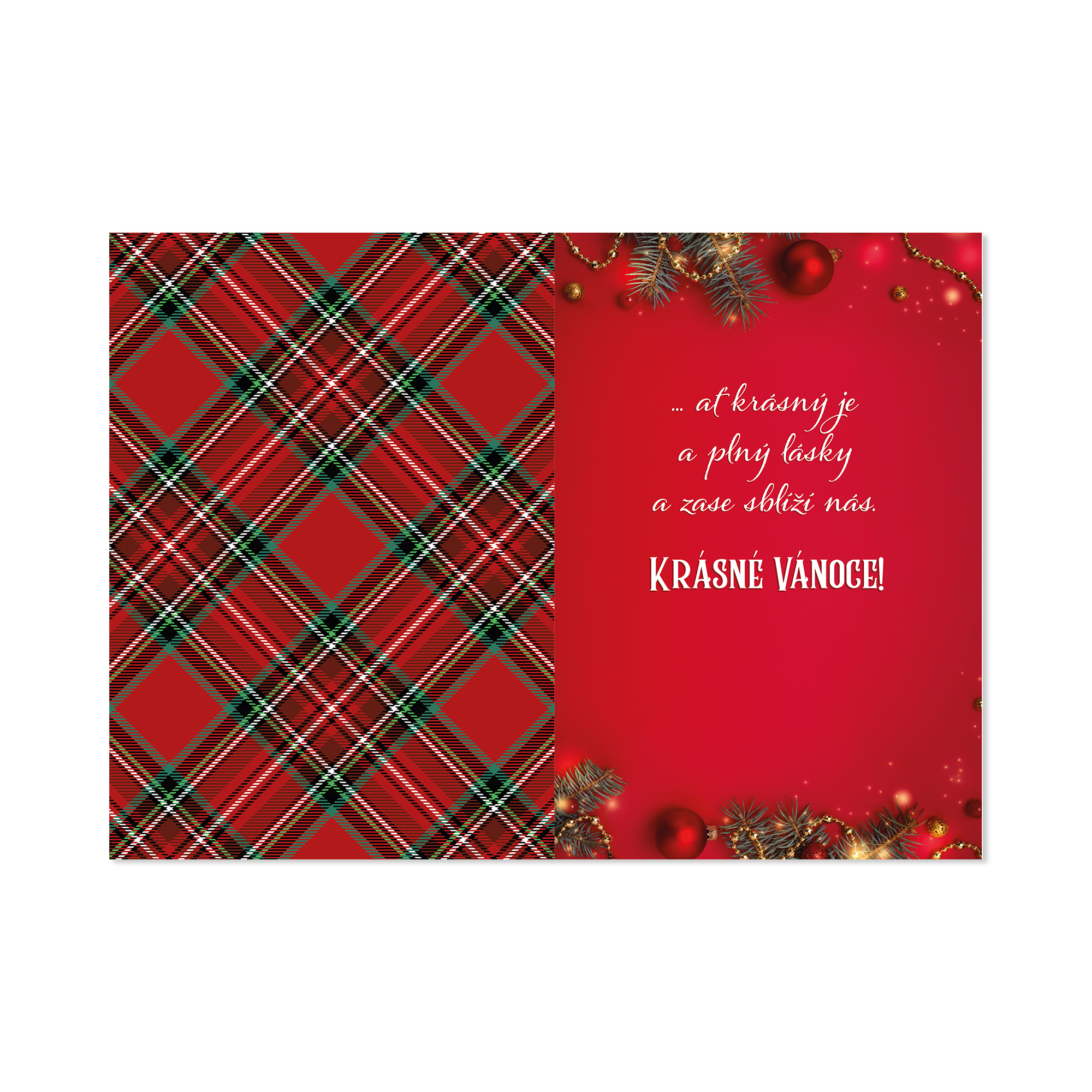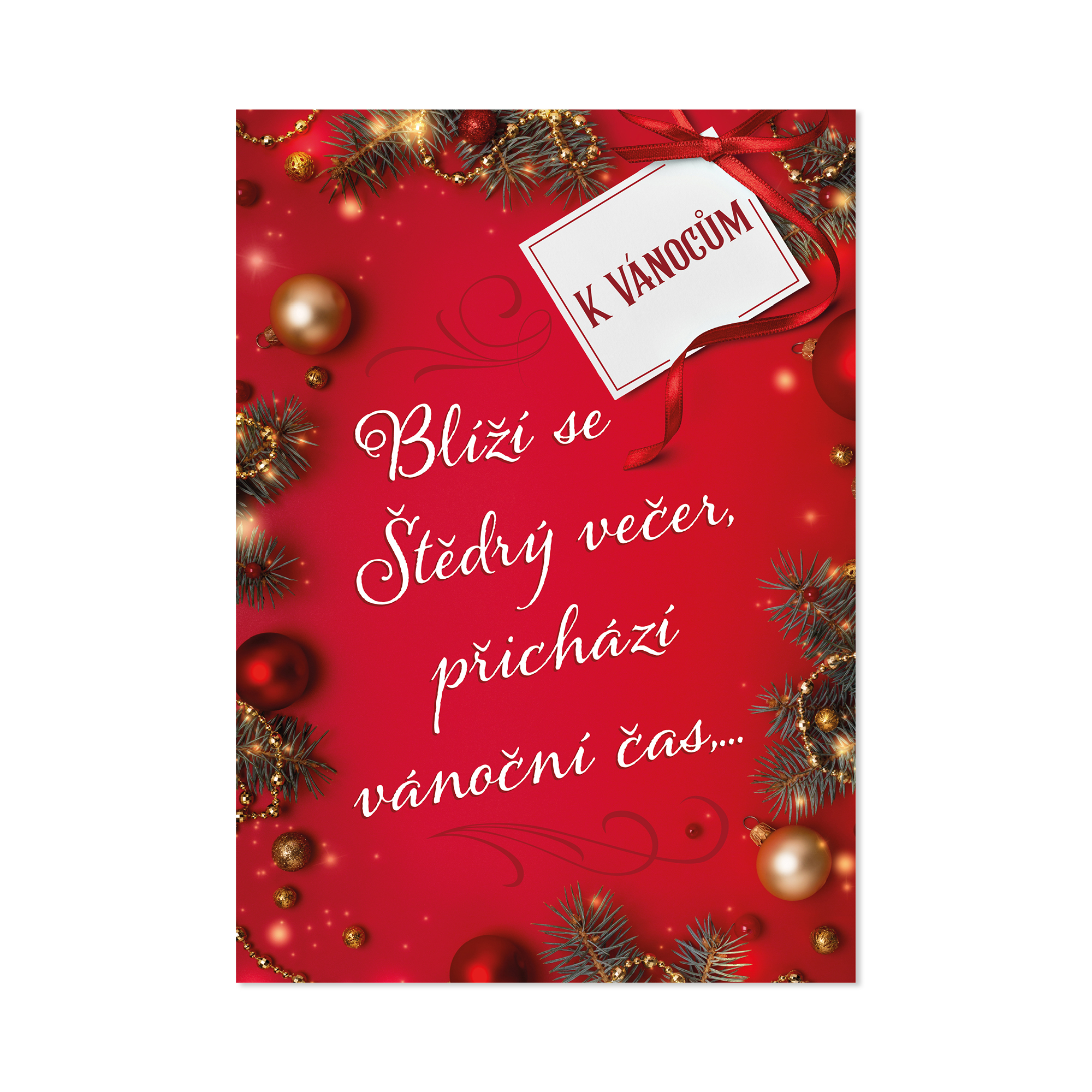 Vánoční hrací přání v červeném designu zdobí ozdoby a větvičky se světýlky. Přední stranu zdobí část milého textu, jehož zbytek najdete uvnitř přání. Můžete připojit také vlastní věnování či podpisy. Po otevření začne hrát část písně od Michala Davida – Čas Vánoc. Text přání: K Vánocům. Blíží se Štědrý večer, přichází vánoční čas… …ať krásný je a plný lásky a zase sblíží nás. Krásné Vánoce! Rozměry: 14,8 × 21 cm
