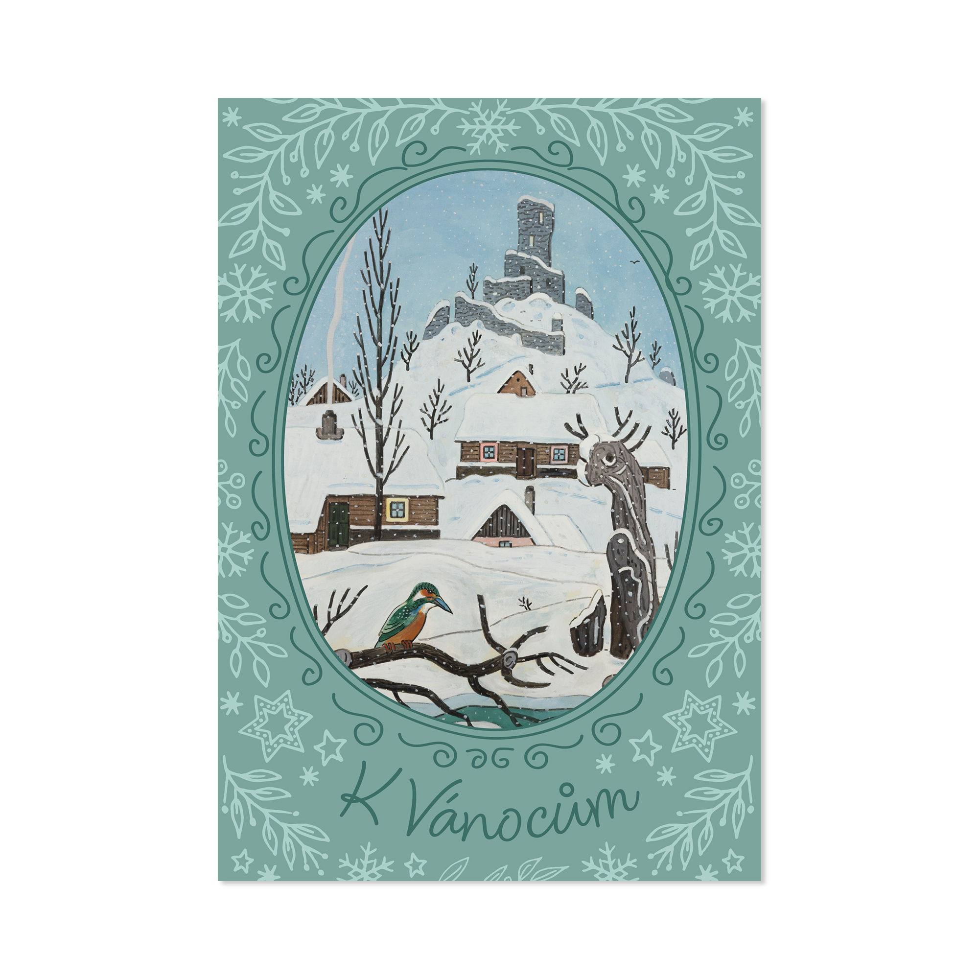 Vánoční přání s ilustrací zasněžené krajiny s malinkatým ledňáčkem z pohádkového světa Josefa Lady. Celý výjev je v oválném rámečku, který lemují bílé vánoční motivy. V dolní části se skví nápis K Vánocům. Uvnitř pak najdete krátký univerzální text, který potěší všechny vaše blízké. Přání zároveň nabízí spoustu místa pro dopsání vlastního věnování. Text uvnitř přání: Příjemné prožití vánočních svátků a mnoho štěstí v novém roce přeje… Rozměry: 13,5 × 19,5 cm