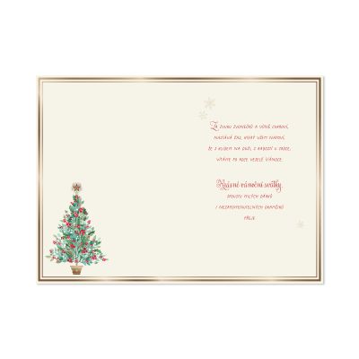 Vánoční přání se zlatým rámečkem a motivem krásného stromečku zdobí nápis Kouzelné Vánoce. Červená a zlatá ražba spolu s jemnými vločkami doplní decentní vzhled. Uvnitř přání najdete milou básničku a krátké univerzální věnování, které potěší všechny vaše blízké. Zároveň poskytne dostatek prostoru pro dopsání vlastního textu či odpisu. Text uvnitř přání: Za zvuku zvonečků a vůně cukroví, nastává čas, který všem napoví, že s klidem na duši, s radostí u srdce, vítáme po roce veselé Vánoce. Krásné vánoční svátky, spoustu milých dárků i nezapomenutelných okamžiků přeje… Součástí balení je i bílá obálka. Rozměry: 13,5 × 19,5 cm