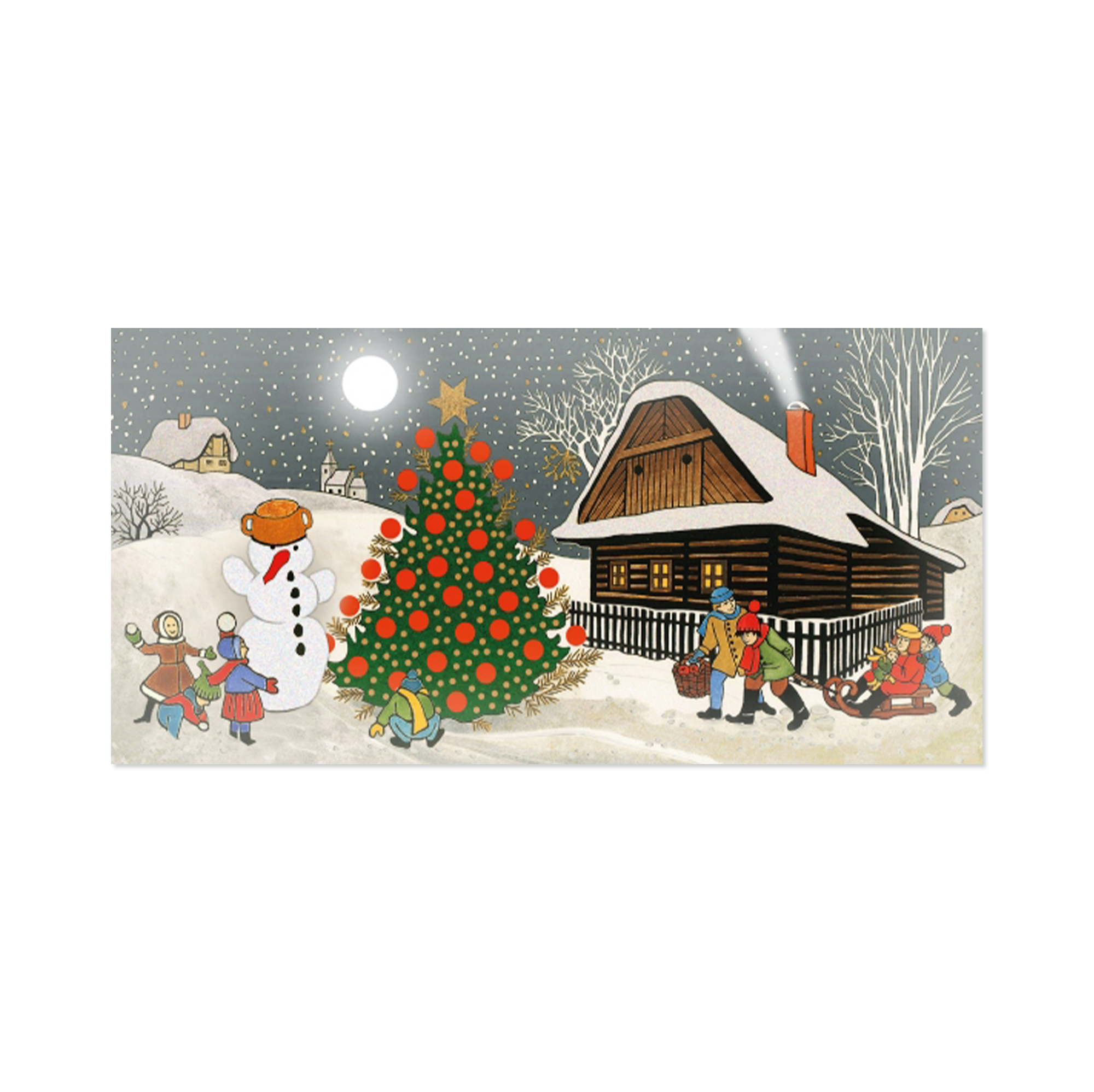 vánoční přání s neobvyklým rozměrem a tradičním motivem výtvarnice Lenky Vojtové potěší vaše blízké. Nostalgická vánoční scenérie z českého venkova obdarovaného rozněžní. Laskavý, rýmovaný text pak jen podtrhne celkový dojem. Rozměry: 10 × 20 cm Text uvnitř přání: Vločky se pomalu snášejí z nebe, mráz do tváří štípe, na rukou zebe, světélka rozzáří svět okolo nás, po roce přichází ten kouzelný čas. Krásné Vánoce.