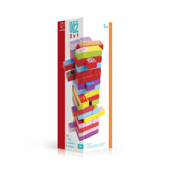 dřevěná hra Věž dříve známá také jako "Jenga" pomáhá rozvíjet jemnou dětskou motoriku i soustředěnost. S barevnými dřevěnými kameny z Věže je možné hrát také pexeso a domino. Pexeso je skvělou cestou, jak trénovat paměť dětí, ale i dospělých. K dominu je třeba trochu té vizuální představivosti, ale zato si pořádně zasoutěžíte! Hra obsahuje: 52 hracích kamenů, hrací kostku a pravidla.