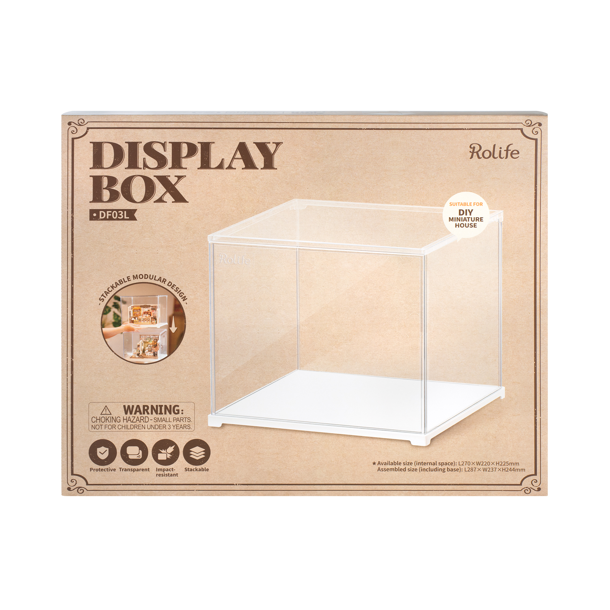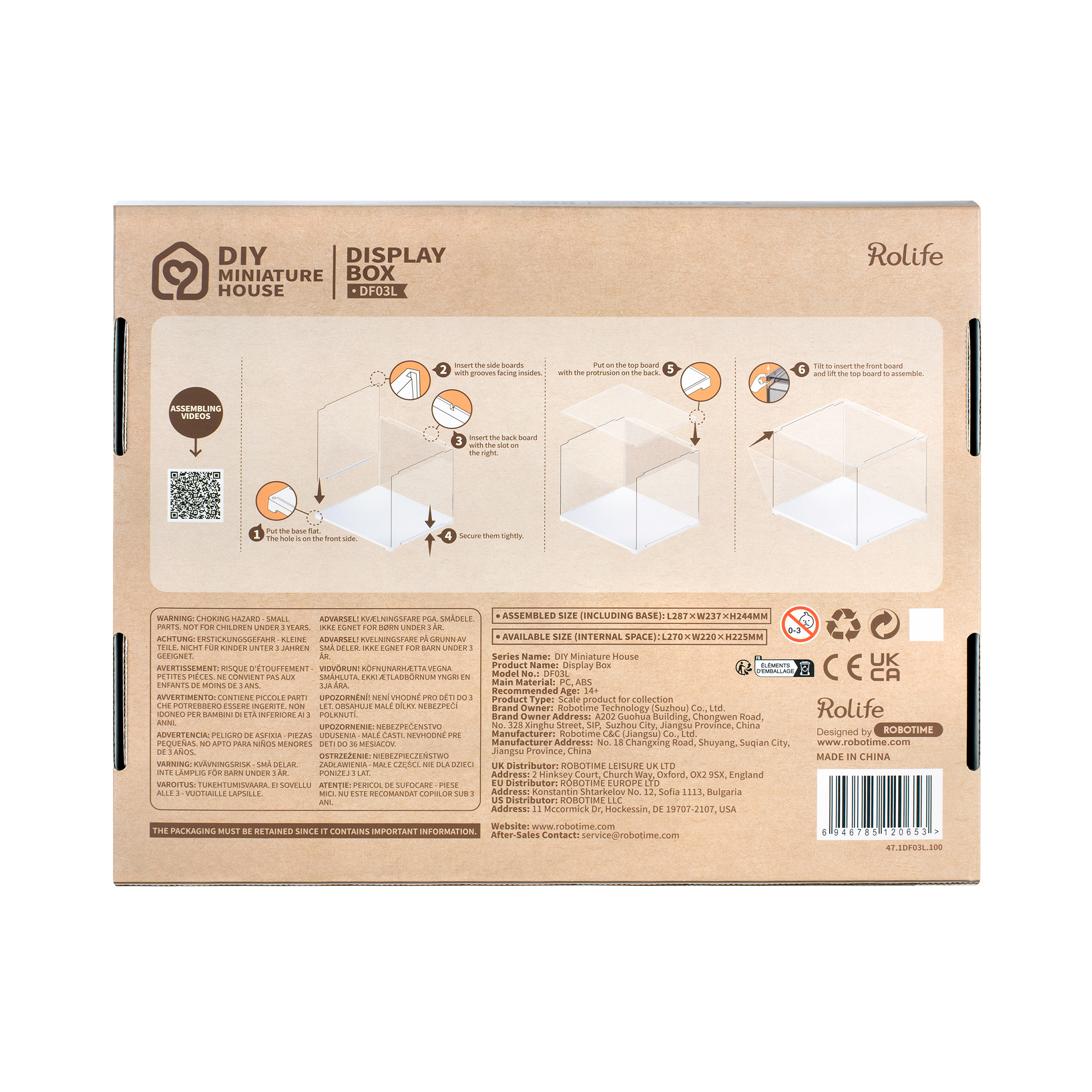 Vitrína na miniaturní domeček Robotime – průhledná ochrana pro vaši dřevěnou stavebnici. Průhledný box je určen pro všechny miniaturní domečky značky Robotime a slouží jako ochrana před prachem, nečistotami a poškozením. Ochranný kryt je vyroben z kvalitního čirého materiálu a k jeho sestavení není potřeba lepidlo. Technické informace Počet dílů: 6 Náročnost: 1/5 Odhadovaný čas sestavení: 3 min Rozměry: 28,7 × 24,4 × 23,7 cm (š × v × h)