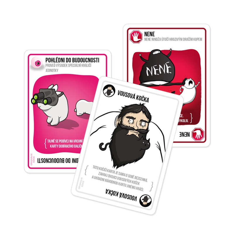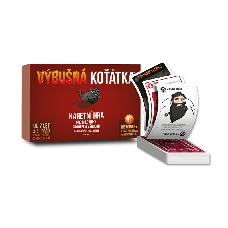 Výbušná koťátka (Exploding Kittens) je kočičí verze Ruské rulety. Hráči se zde střídají v tazích, během kterých si dobírají karty, dokud takto někdo neobdrží vybuchující koťátko, čímž prohraje hru. Balíček karet se však skládá z karet, které vám umožňují výbuchu se vyhnout, například tím, že se budete moci podívat na karty předtím, než si je vezmete, přinutit protivníka vzít si několik karet najednou či zamíchat balíček. S každou další kartou je hra napínavější a napínavější, protože jak se jejich počet snižuje, zvyšuje se zároveň pravděpodobnost, že si doberete koťátko a efektně se vyhodíte do povětří. Hra Výbušná koťátka obsahuje: 56 karet a pravidla.