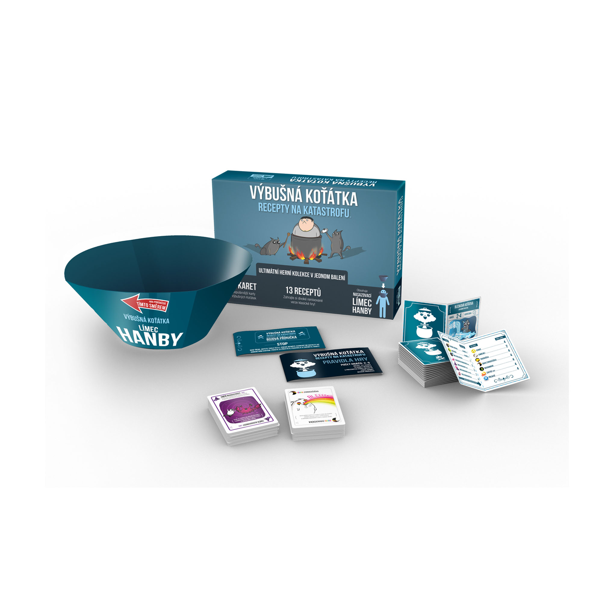 Nadupaná sbírka toho nejlepšího z Výbušných koťátek! Recepty na katastrofu přinášejí vše, co začátečníci pro svou první hru Výbušných koťátek potřebují. Zkušenějším hráčům pak nabízejí výběr těch nejlepších karet z rozšíření hry spolu s brožurami receptů, díky kterým otevřete více jak tucet nových herních variant. zábavná a jednoduchá karetní hra pro děti i dospělé, která je ideální pro všechny příležitosti, včetně rodinného herního večera, oslavy, výletu na pláž, dovolené nebo popíjení s přáteli! Vhodná pro začátečníky, naučíte se ji během 2 minut – Je to jednoduché! Pokud si vytáhnete výbušné koťátko, prohrajete a jistě vás to zaplaví obrovským smutkem… Všechny ostatní karty v balíčku vám pomohou vyhnout se riziku vytažení výbušného koťátka nebo zneutralizují jeho účinek. Pokud nevybuchnete, VYHRÁLI JSTE! Málem bychom zapomněli zmínit límec hanby, který je také součástí balení! Je to taková věcička… No prostě první hráč, který buď zapomene, čí je tah, nebo jaký je směr hry, se stane lidským ukazatelem směru hry a do konce hry si nasadí Límec hanby. Balení obsahuje: 121 hracích karet,13 brožur s recepty, 5 prázdných brožur na recepty, 1 límec hanby, 1 česká pravidla a 1 bojovou příručku.