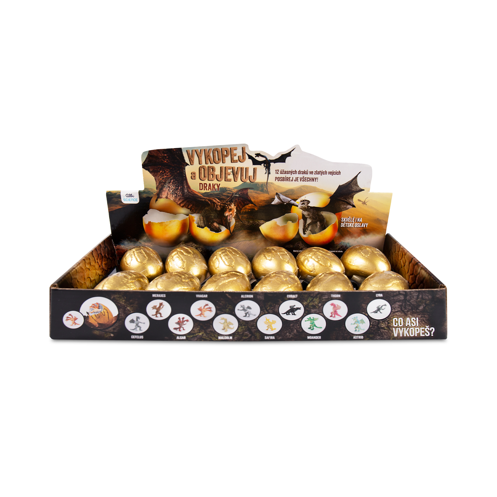 Jedinečná sada Vykopej a objevuj – Draci skrývá kompletní set 12 zlatých vajec s dračími figurkami v dárkovém balení. Každá figurka v této sadě je jiná. Děti se promění v malé dobrodruhy a za pomoci speciálních nástrojů, které jsou součástí sady, budou krok za krokem odkrývat tajemství ukryté ve vejcích, kde je každá figurka draka zcela jiná. Krabice sady je navíc navržena tak, aby ji šlo snadno přeměnit na stylovou výstavku! Stačí ohnout víko a je to! Vejce pak můžete postupně odhalovat jedno po druhém, čímž děti zabavíte na hodiny i dny a vytvoříte jim tak vlastní malé dračí království přímo v pokojíčku. TIP: Tato sada je ideální na narozeninové oslavy, kde nejenže děti potěšíte kreativní zábavou, ale také si odnesou vzpomínku na doma. Sada Vykopej a objevuj – Draci obsahuje: 12 sádrových vajec s figurkami, 12 malých nástrojů.